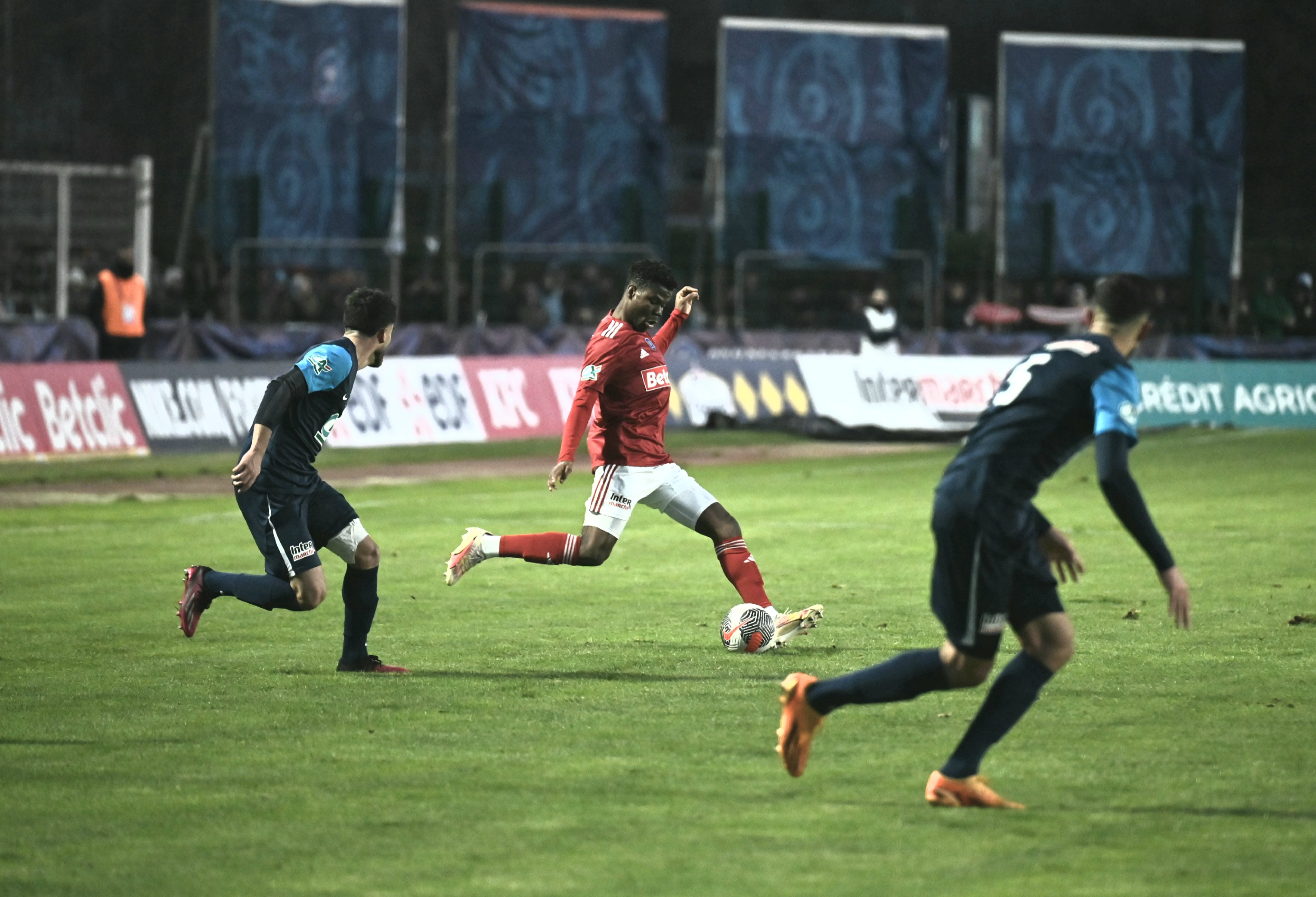 Le Stade Brestois a craint le pire lorsque Trélissac-Antonne PFC a ouvert le score par Benoît Bisson (75e). Mais les Bretons ont égalisé dans la foulée sur un penalty de Kenny Lala (78e, photo ci-dessous en rouge), avant de s’en sortir (1-2) grâce à Martin Satriano (88e).