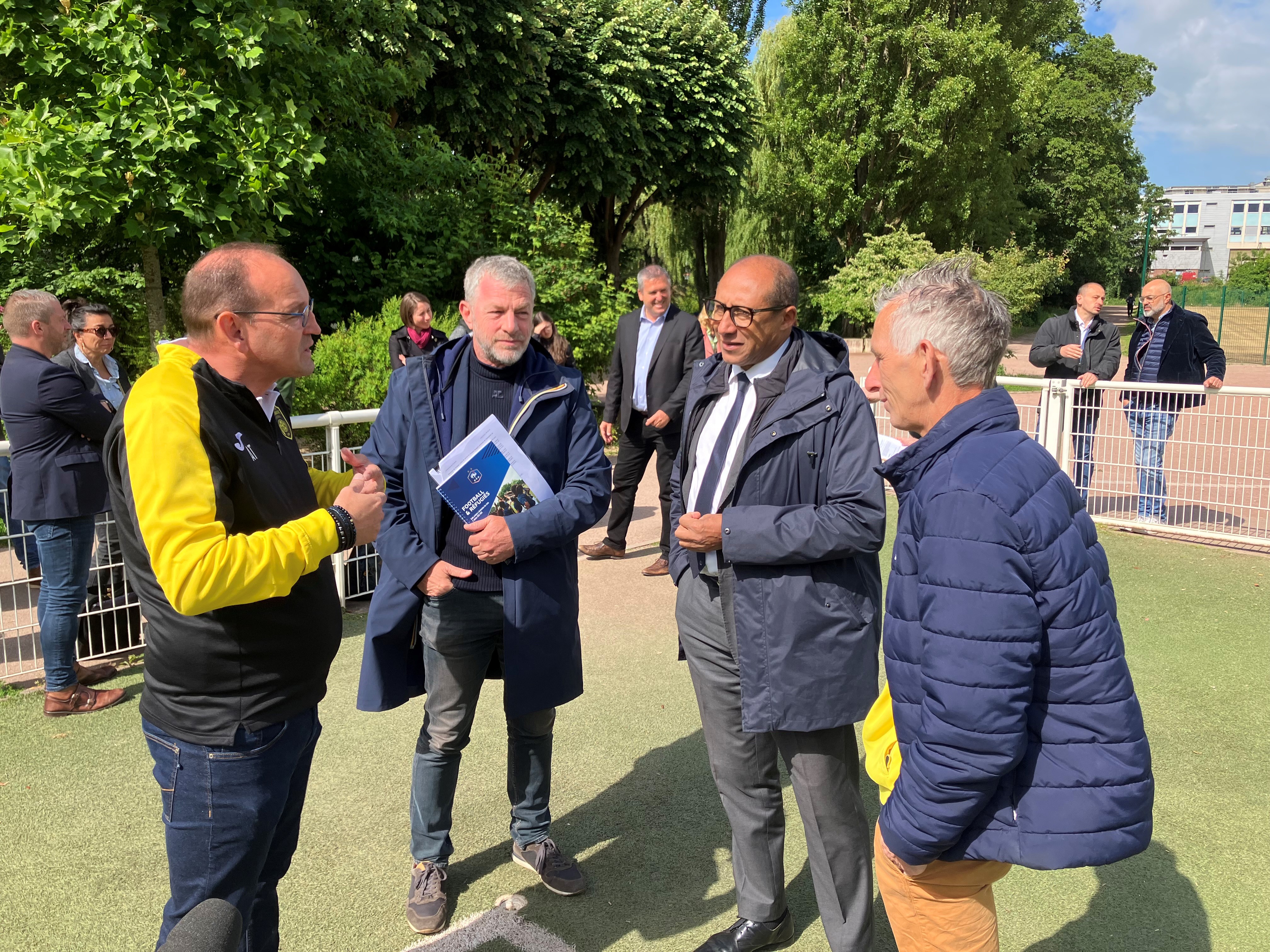 Anthony Trolet, président du club rouennais (à gauche), accueille Jacques Bungert, président du Fondaction du Football (deuxième à gauche) et Philippe Diallo, président de la FFF (photo Philippe MAYEN / FFF).