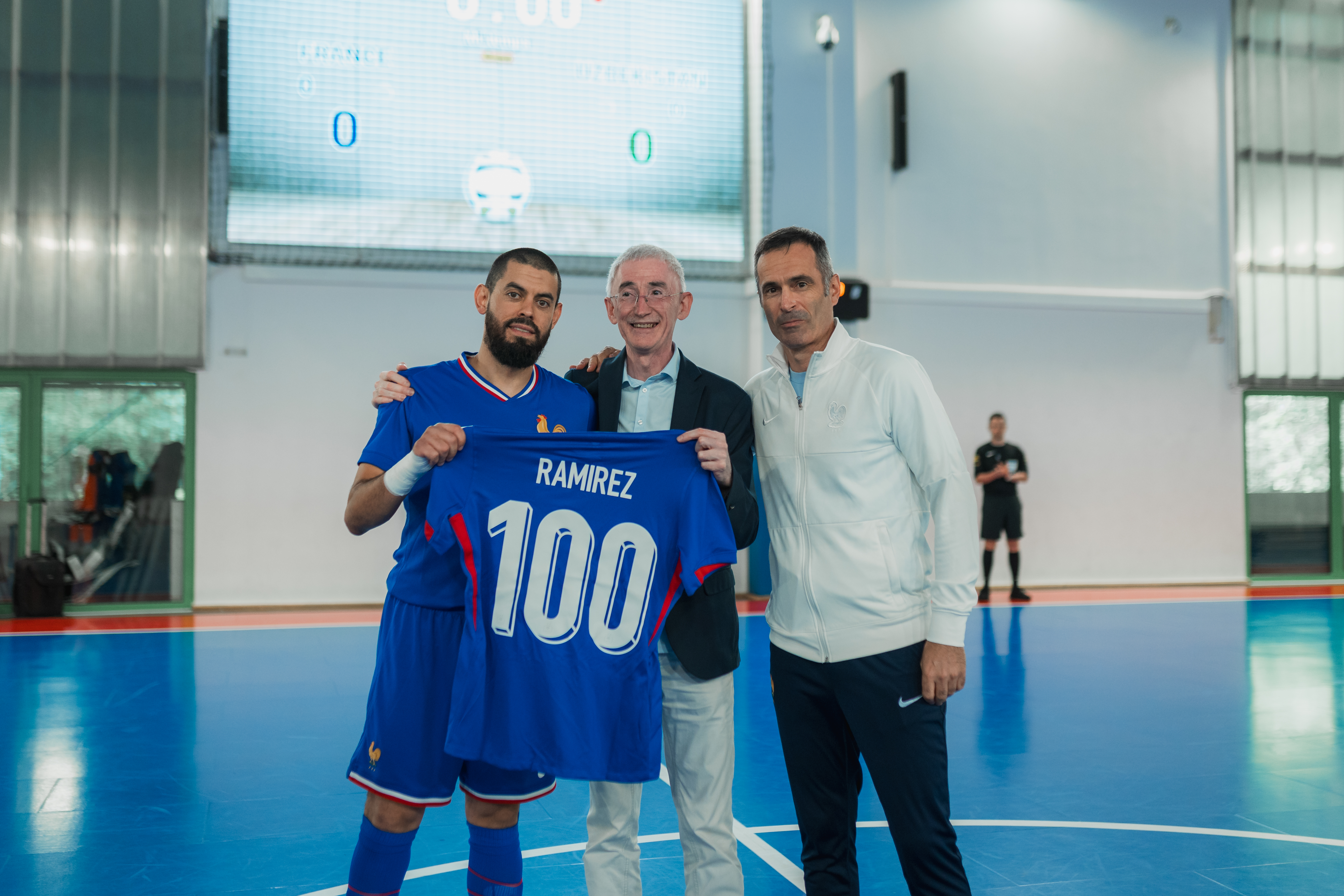 Kévin Ramirez avec Philippe Lafrique, chef de délégation et membre du Comité Exécutif, et le sélectionneur Raphaël Reynaud (Charles LÉGER / FFF)