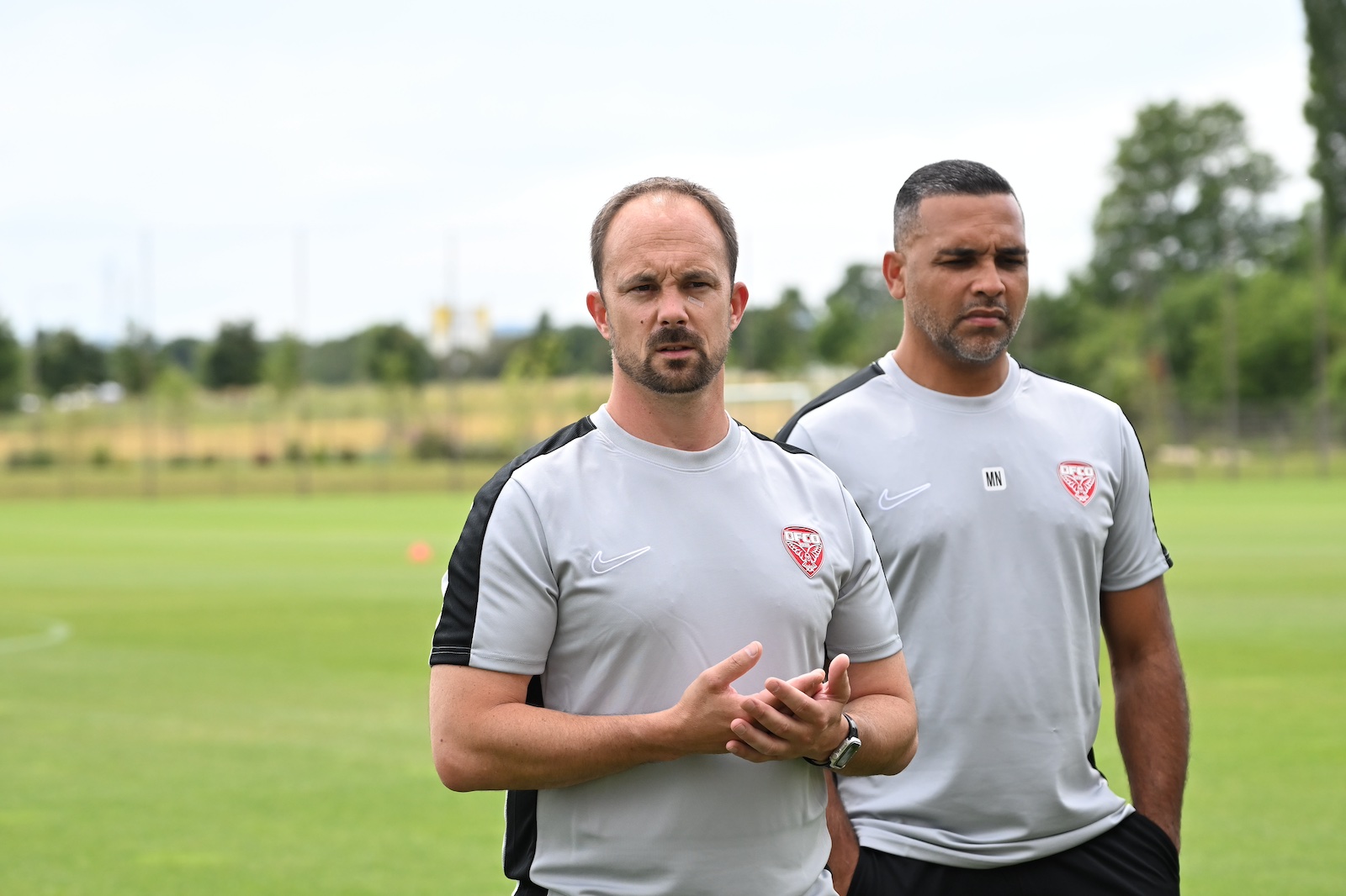 « Le DFCO est en pleine reconstruction. J’ai été sollicité par le nouveau repreneur du club, Pierre-Henri Deballon, qui est arrivé avec une nouvelle vision des choses. Que ce soit avec le coach que je suis, issu d’un parcours amateur, ou avec le nouveau directeur général, Paul Fauvel, qui avait 28 ans à son arrivée, et le président 41 ans, il y a la volonté de s’inscrire dans un moyen terme, au minimum. J’espère que ce sera du long terme, mais évidemment ce sera questionné par les résultats, on est dans un milieu qui ne peut pas se permettre d’attendre. Malgré tout, la ligne directrice est de construire, même si on a des bases très saines, avec pour objectif de retrouver la Ligue 2 dans les trois prochaines saisons. Les infrastructures que je découvre depuis juillet, un staff pro avec plus de gens à temps plein et à disposition pour parfaire la préparation et la gestion de l’effectif, tout ça me permet de me concentrer sur mon métier d’entraîneur ».