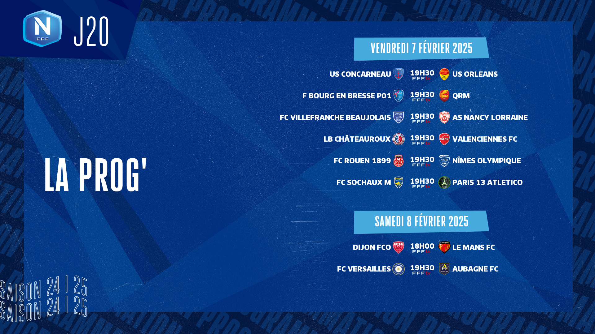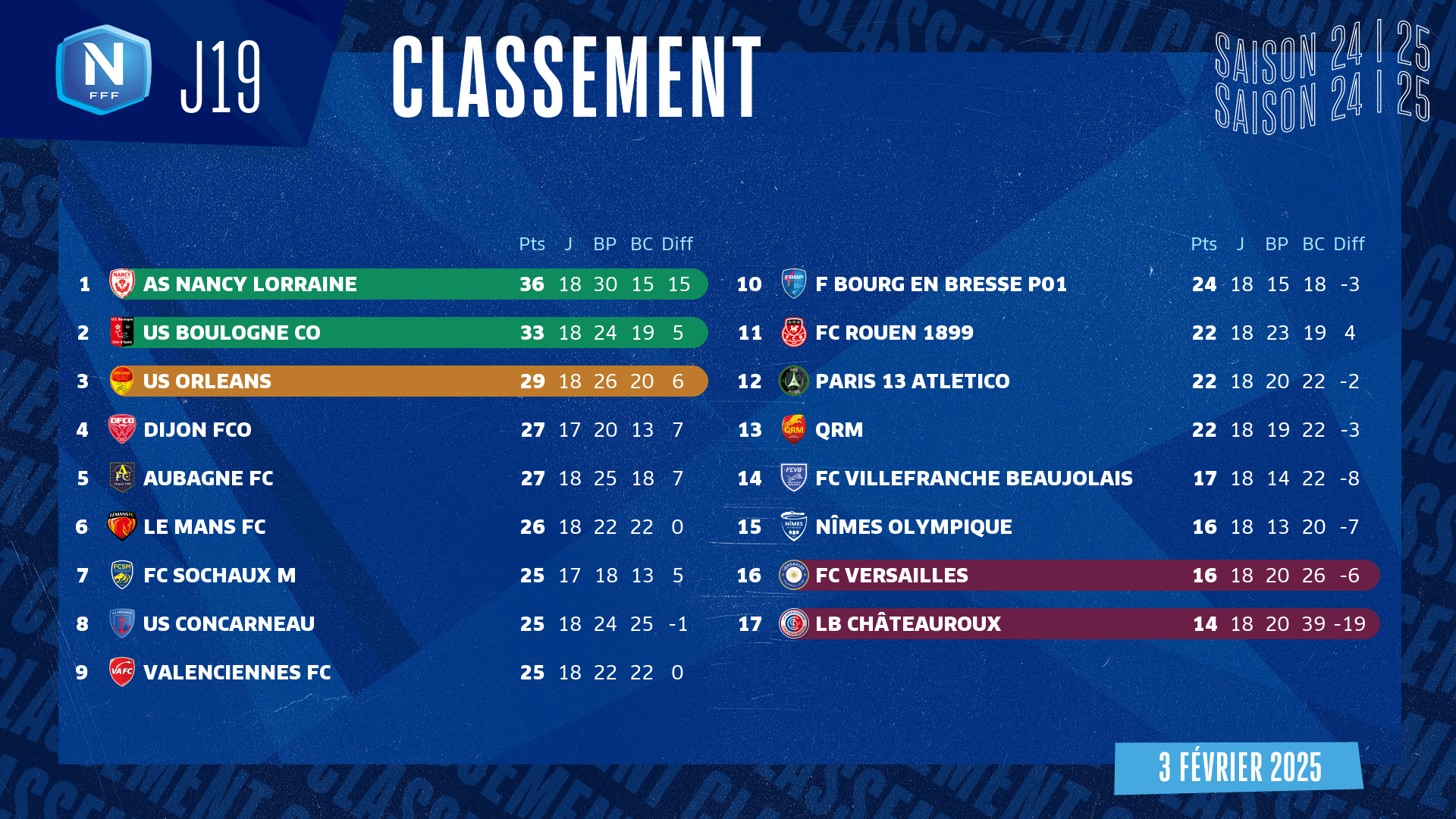 Six matches sont programmés vendredi à 19h30, et deux se joueront samedi : Dijon-Le Mans à 18h00 et Versailles-Aubagne à 19h30. Boulogne (33 pts) est exempt mais sa deuxième place n’est pas menacée, et encore moins celle du leader Nancy (36 pts), qui se déplace à Villefranche. Orléans (3e, 29 pts) compte en effet quatre points de moins que les Boulonnais mais pourrait se rapprocher s’il prend des points à Concarneau. Le club loirétain reste à portée de Dijon (4e, 27 pts), qui reçoit Le Mans (6e, 26 pts), et d’Aubagne (5e, 27 pts), qui se déplace à Versailles.