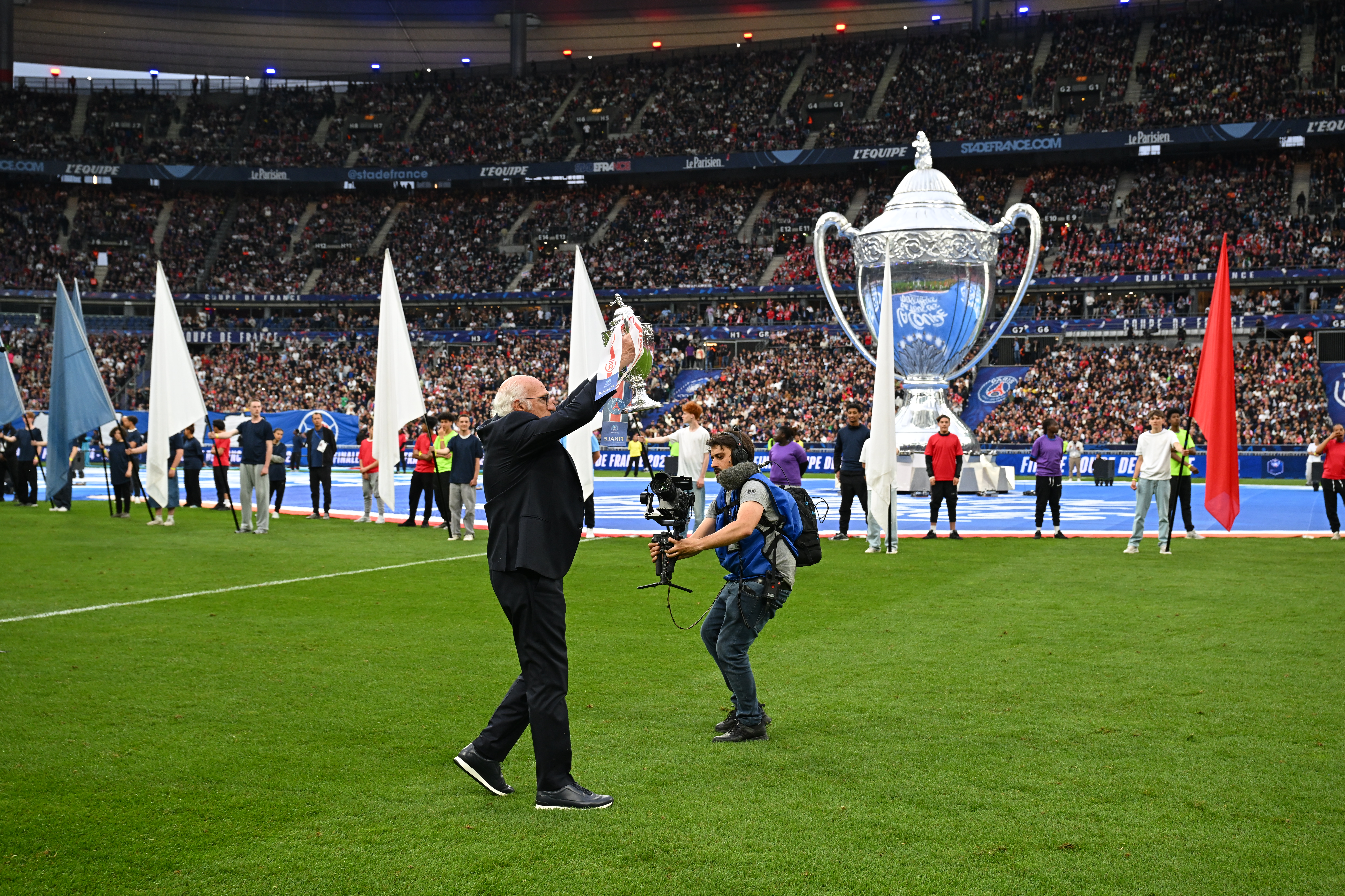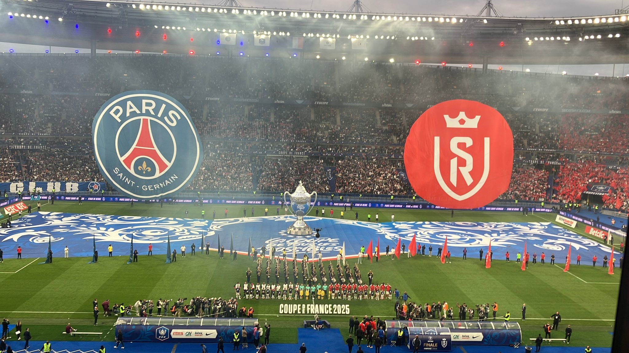 Cette 107e finale de la Coupe de France s'est disputée à guichet fermé. 77 101 spectateurs ont garni les tribunes du Stade de France pour assister à cette affiche inédite dans l'histoire de la compétition, entre le Paris SG et Reims. Les deux clubs ont reçu 20 000 billets chacun pour leurs supporters. C'est la quatrième fois d'affilée depuis 2022 que la finale de la Coupe fait stade comble, après deux éditions perturbées par la pandémie de Covid-19 (les finales 2020 et 2021 se jouant en jauge très réduite).