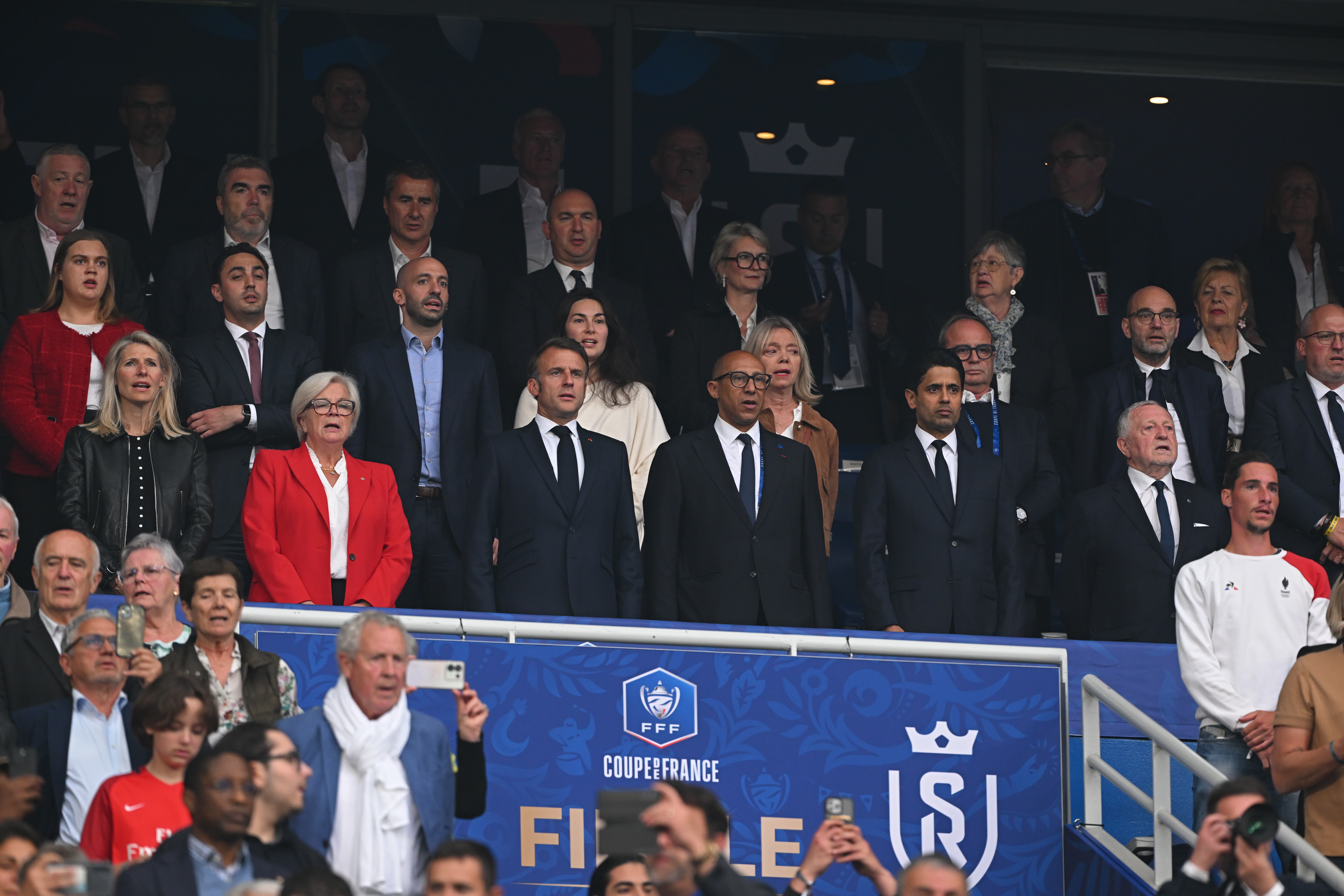 Tradition oblige, le président de la République Emmanuel Macron, accompagné de son épouse Brigitte, a présidé cette 107e finale de la Coupe de France. Le chef de l'État a pris place en tribune officielle aux côtés de Marie Barsacq, ministre des Sports, de la Jeunesse et de la Vie associative, Philippe Diallo, président de la Fédération Française de Football, Nasser al-Khelaïfi et Jean-Pierre Caillot, présidents du Paris Saint-Germain et du Stade de Reims, Jean-Michel Aulas, président de la Ligue Féminine de Football Professionnel (LFFP), notamment (photo ci-dessous).