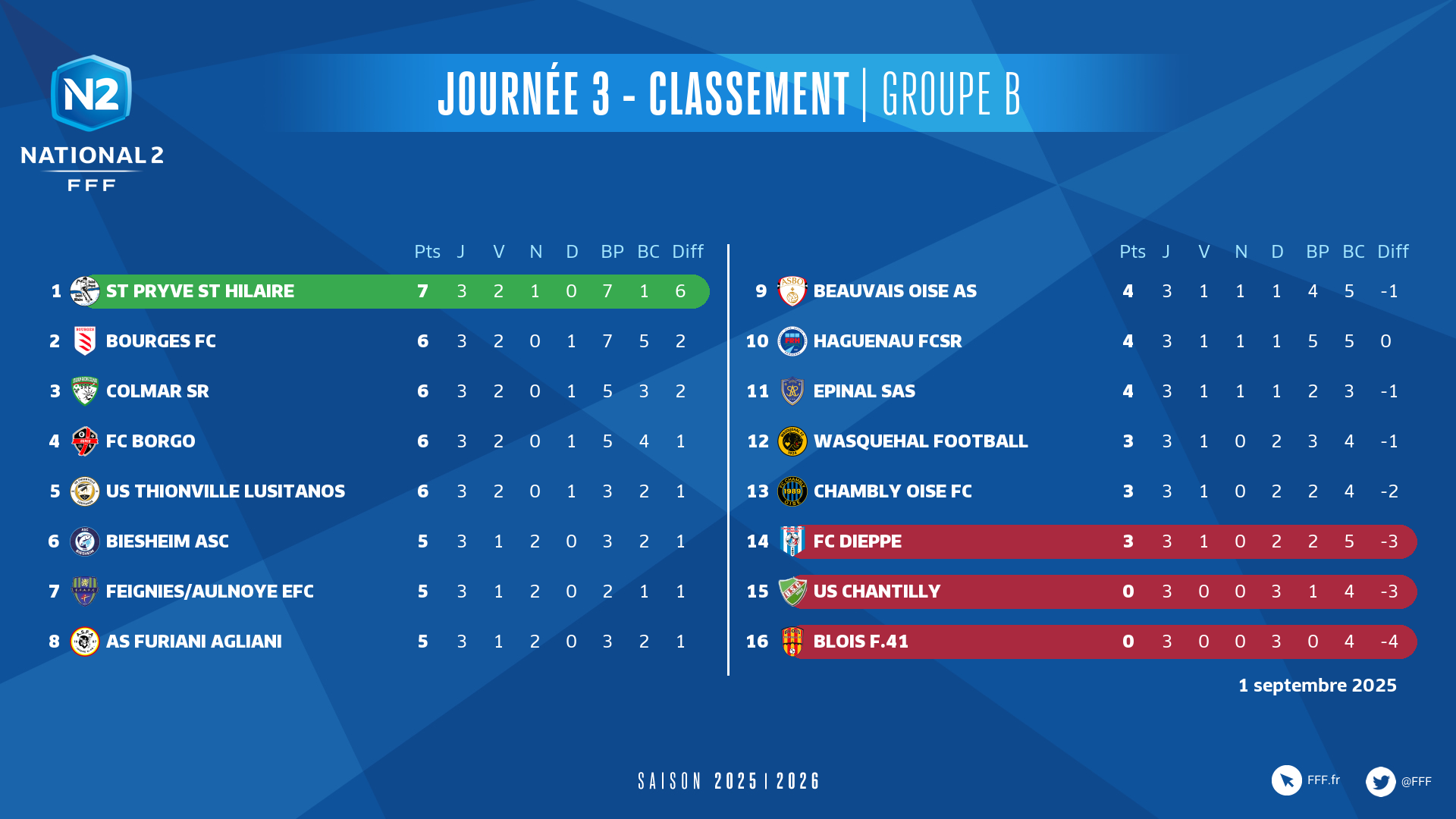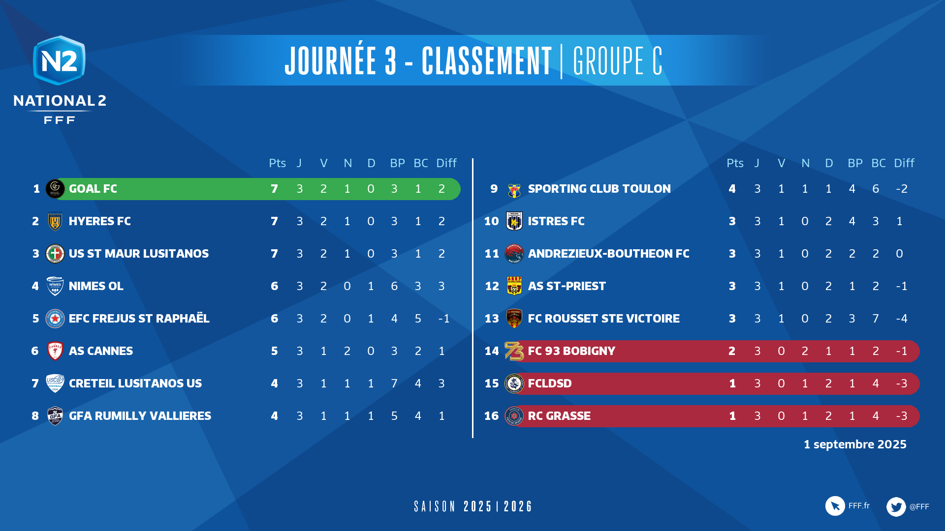 Étalée sur quatre jours avec trois matches joués jeudi et vendredi pour se terminer dimanche par la confrontation du groupe B entre l’US Chantilly et l’AS Furiani Agliani, la 3e journée du National a vu l’essentiel de ses rencontres disputée le samedi 30 août. Pour aboutir à des changements en tête de chacun des trois groupes : Angoulême et Poitiers sont en duo pour le A avec trois victoires chacun, Saint-Pryvé Saint-Hilaire en solo pour le B, GOAL, Hyères et Saint-Maur en trio pour le C.