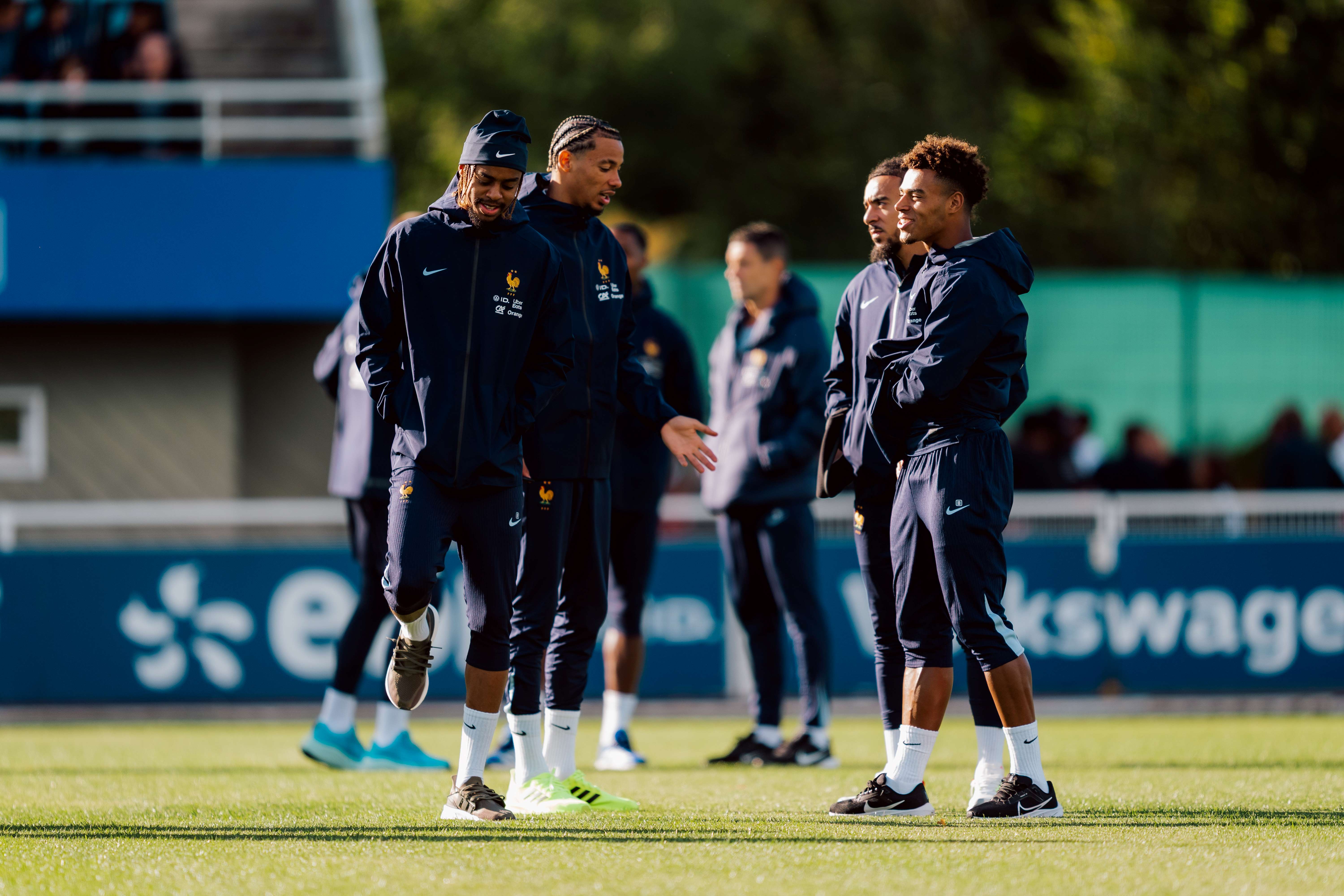 Premier entraînement pour Hugo Ekitiké, entouré de Bradley Barcola, Malo Gusto et Désiré Doué (photo Simon MORCEL / FFF)