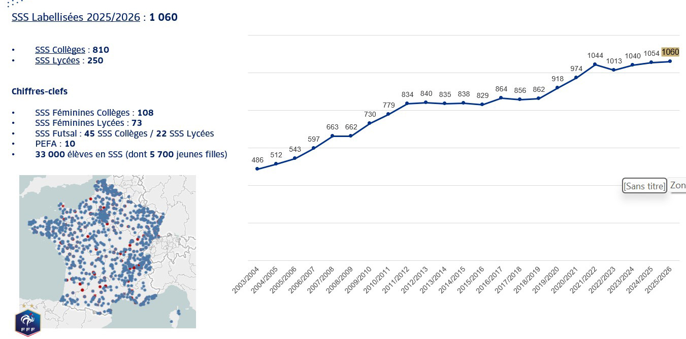 La labellisation des sections sportives scolaires n'a quasiment pas cessé de suivre une courbe ascendante. Leur nombre n'était ainsi que de 486 en 2003-2004. Au total, quelque 33 000 élèves dont 5 700 jeunes filles (autre record) sont aujourd'hui hébergés dans ces SSS et PEFA, contre 32 500 en 2024-2025.