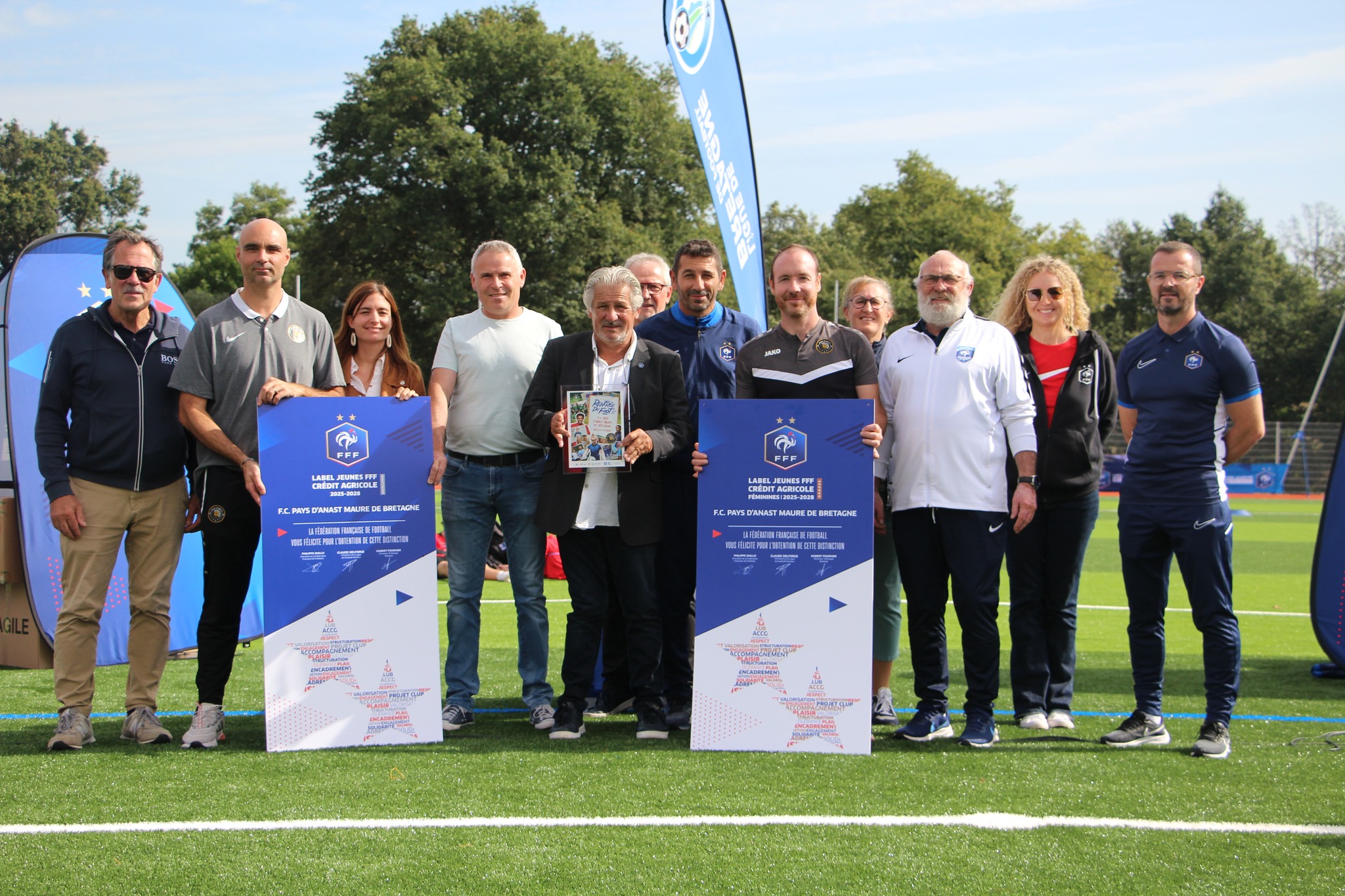 Pour ses cinquième et sixième étapes, la tournée de la Rentrée du Foot 2025 avait d'abord rendez-vous au FC Pays d'Anast, à Maure-de-Bretagne (District Ille-et-Vilaine / Ligue de Bretagne), samedi 20 septembre. Cette belle après-midi dédiée au football des jeunes a été marquée par la remise du Label Jeunes FFF-Crédit Agricole Excellence et du Label Jeunes FFF-Crédit Agricole Féminines Bronze (pour la période 2025-2028) au club breton, en présence de Pierric Bernard Hervé, membre du Bureau exécutif de la Ligue du Football Amateur (LFA), et José Alcocer, entraîneur (photo ci-dessous).