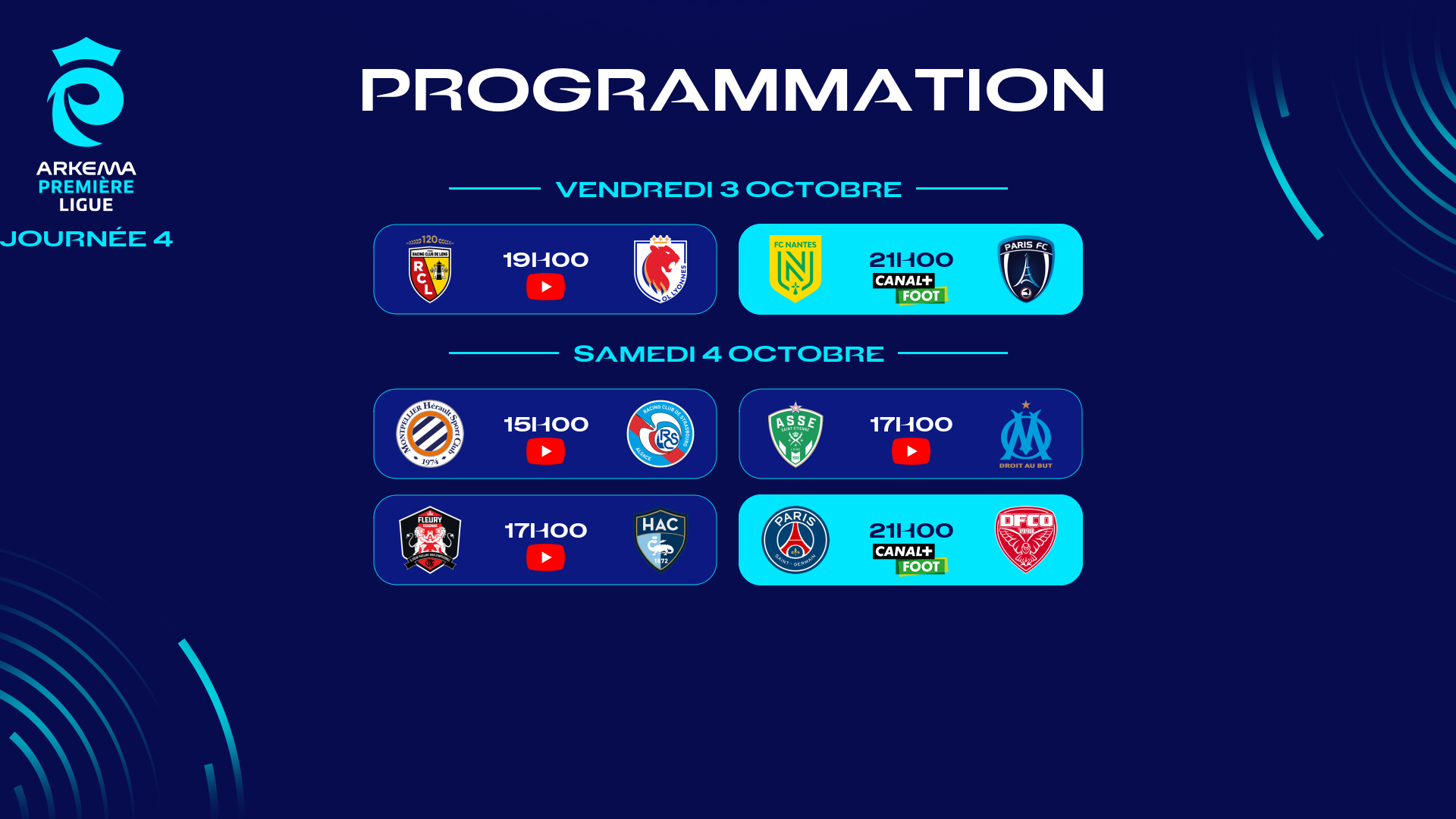 Lancée par deux affiches, Lens-OL Lyonnes et Nantes-Paris FC, avancées au vendredi 3 octobre, la 4e journée s’achèvera le lendemain avec quatre matches échelonnés de 15h00 à 21h00.