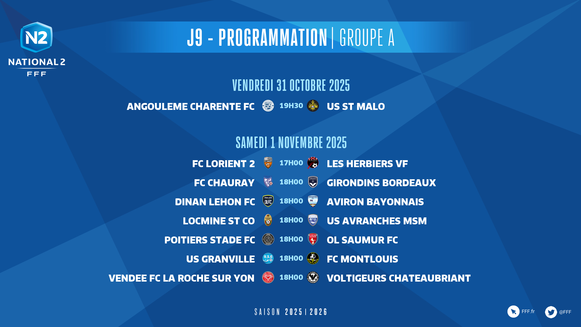 - 19h30 : Angoûleme Charente FC (4e, 14 pts) - US Saint-Malo (7e, 12 pts)