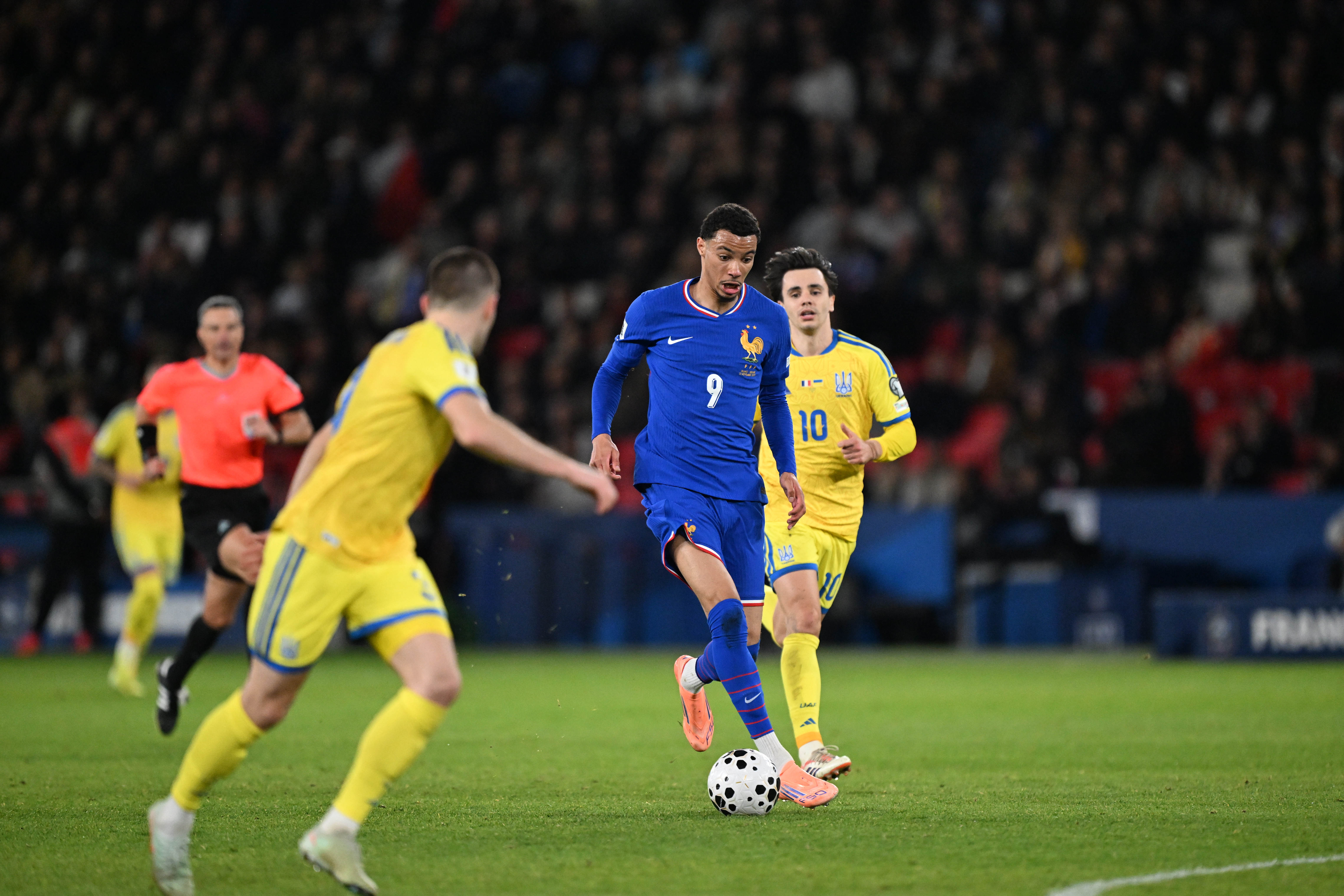 Rapidement installés dans le camp adverse et repoussant règulièrement les Ukrainiens dans leurs vingt mètres, les Bleus, largement dominateurs, ne se sont toutefois pas créé d'occasions de but très nettes en première période, faute de rapidité dans leurs mouvements. Pour Trubin, le danger est ainsi essentiellement venu de deux tirs de Michael Olise (4e) et Kylian Mbappé (17e), bien captés, et surtout de Bradley Barcola, auteur d'une frappe enroulée que le gardien ukrainien a détourné au prix d'une belle détente (42e).
