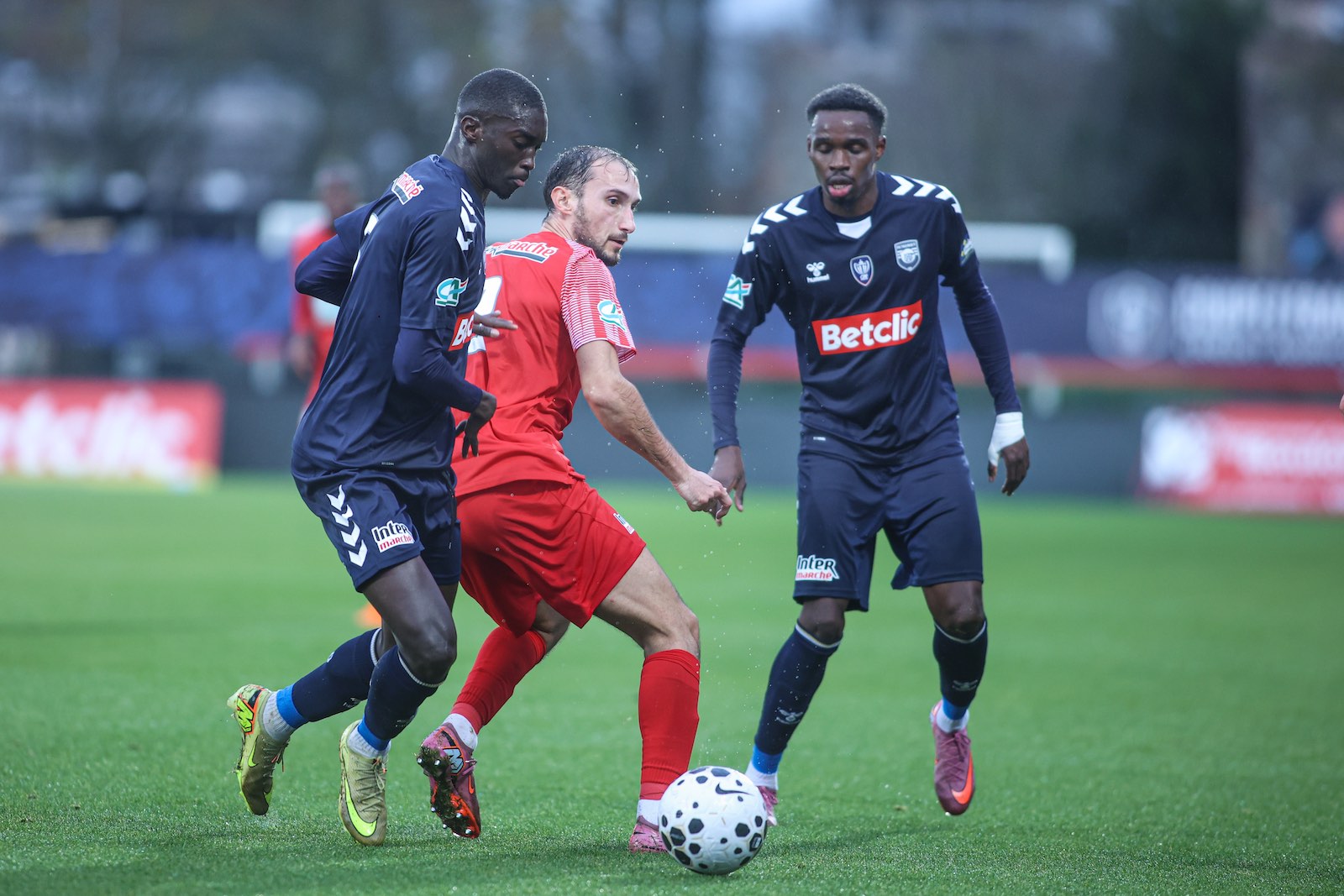 L'USL Dunkerque (en bleu) a sorti l'US Boulogue CO (en rouge) aux tirs au but (Photo Simon SZCPESKI / FFF)