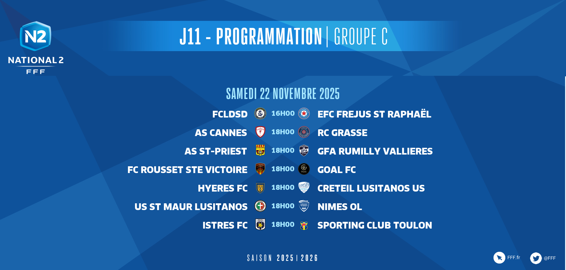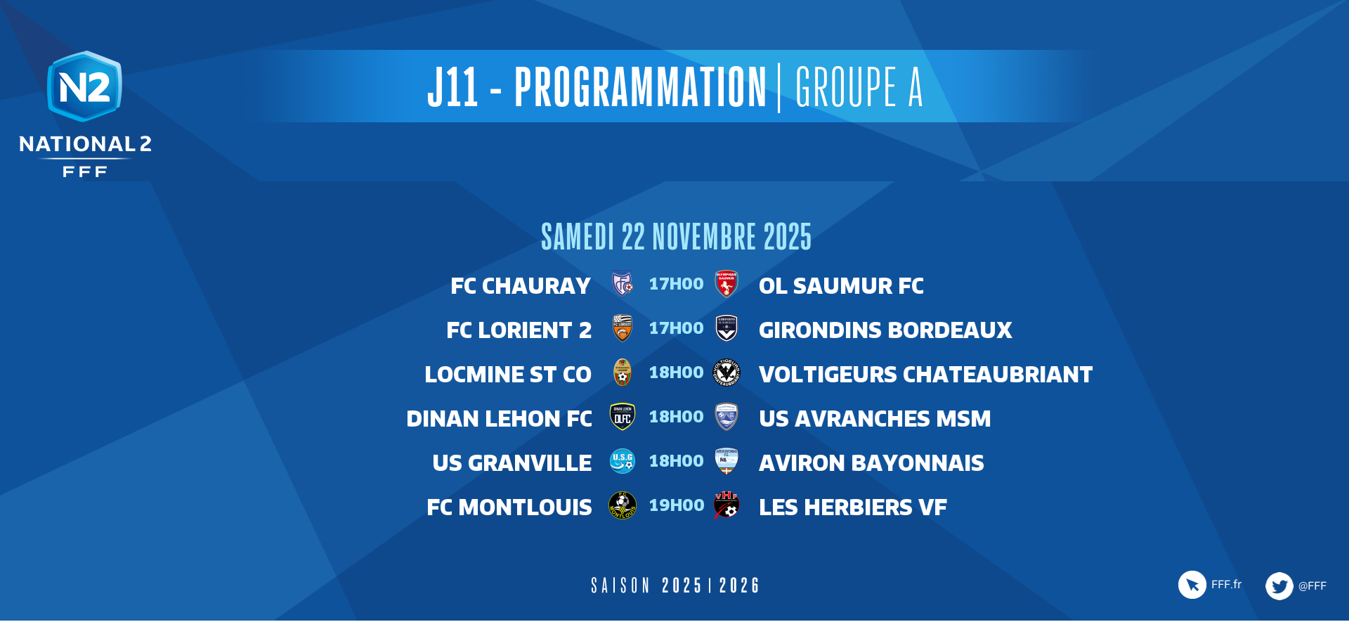 Suite et fin des rencontres ce samedi 22 novembre avec des coups d'envoi à 15h00, 16h00, 17h00, 18h00 et 19h00.