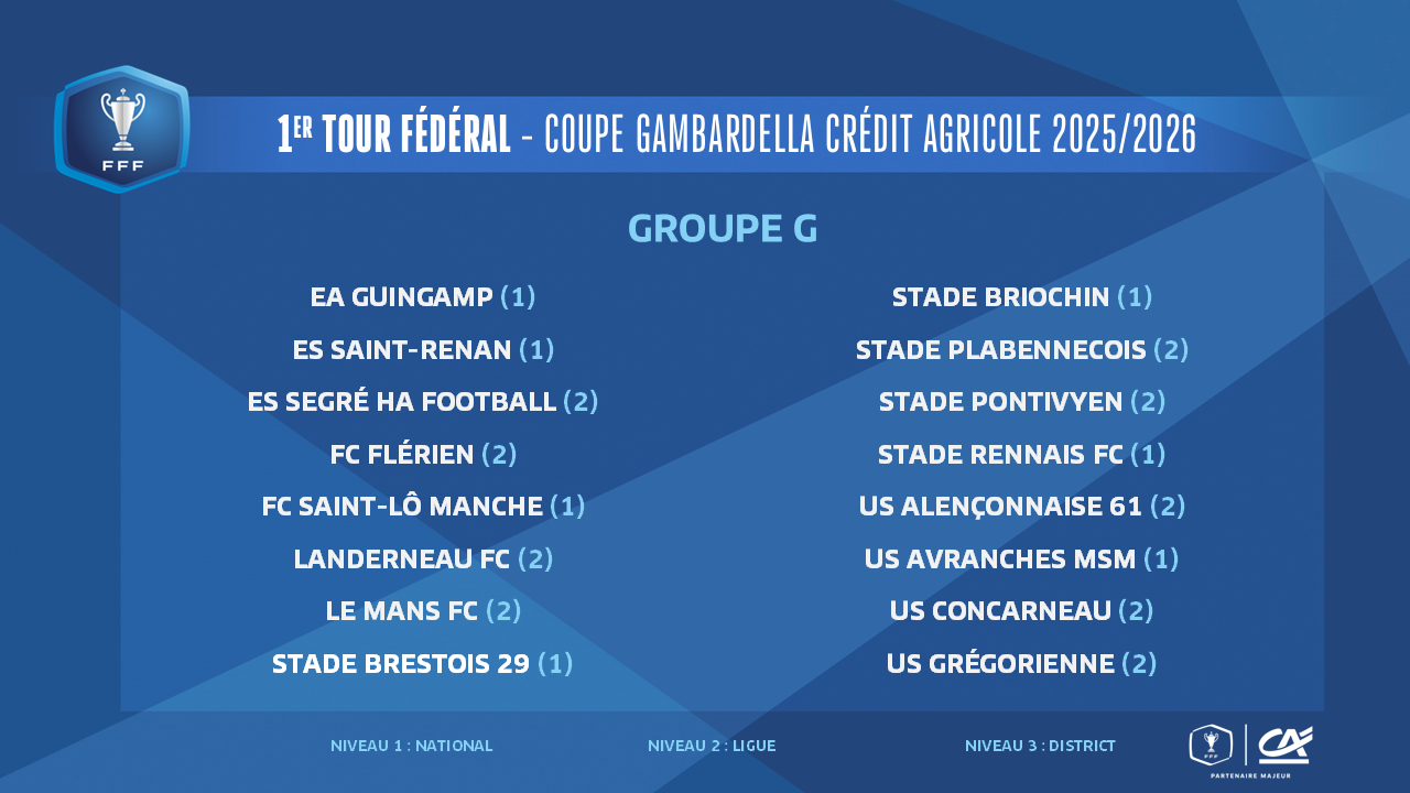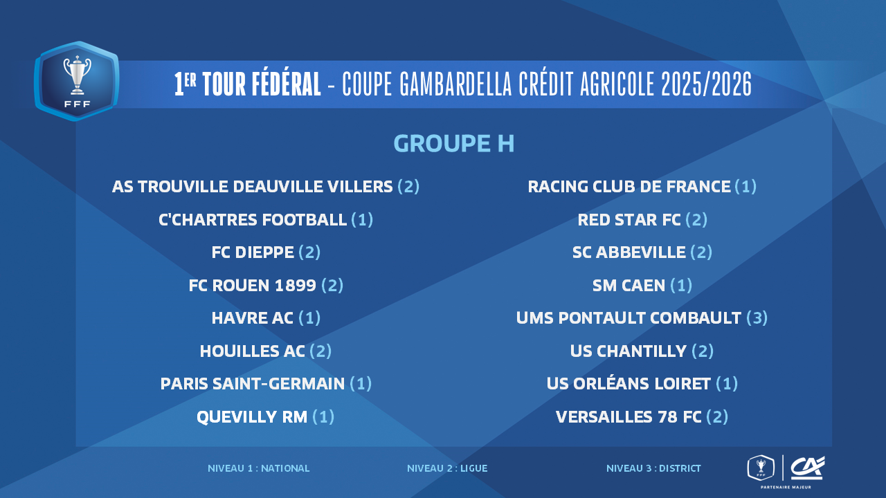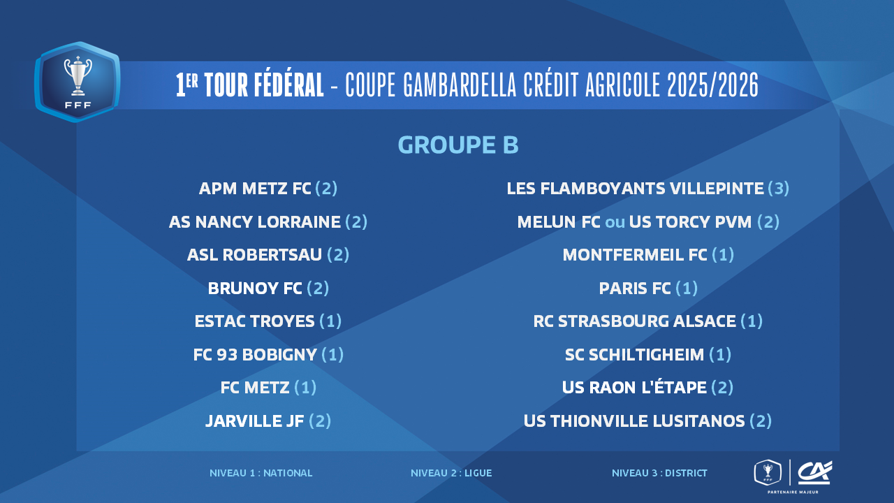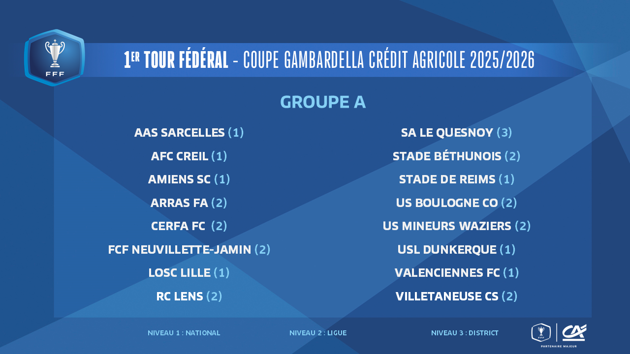 Les affiches du 1er tour fédéral de la Coupe Gambardella-Crédit Agricole 2025-2026 seront connues ce midi, à l'issue du tirage au sort qui sera effectué au siège de la FFF à Paris à partir de 12h00 (en direct sur YouTube FFF).
