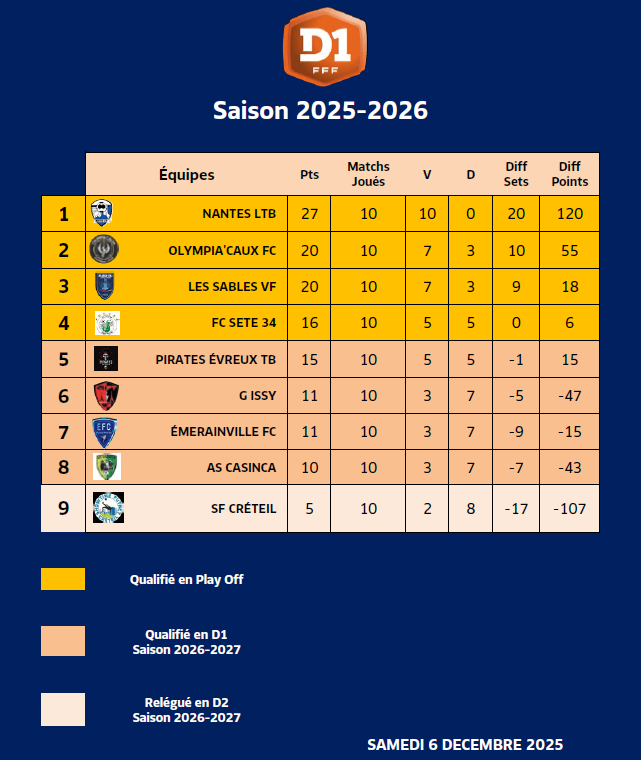 Les quintuples champions de France ont consolidé leur place de leader tandis que les Sables VF ont profité de la défaite de l’Olympia’Caux FC pour recoller derrière. Le point après la 5ème journée disputée samedi 6 décembre.