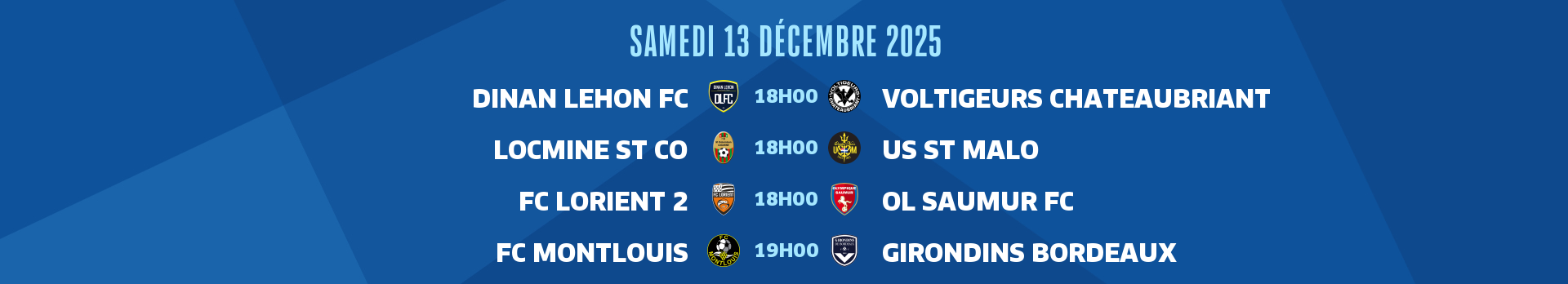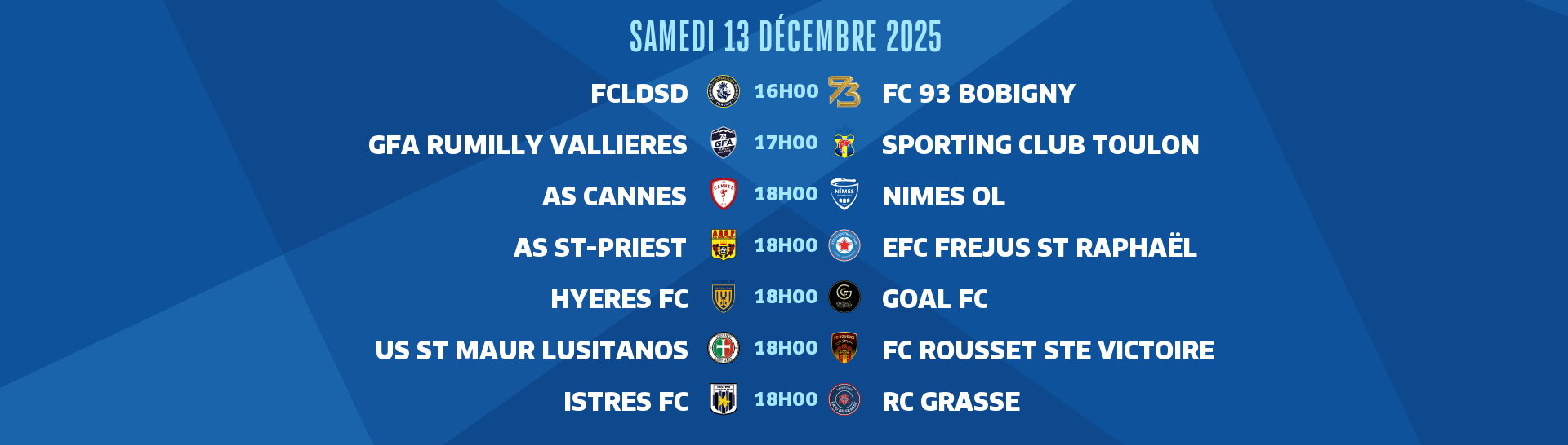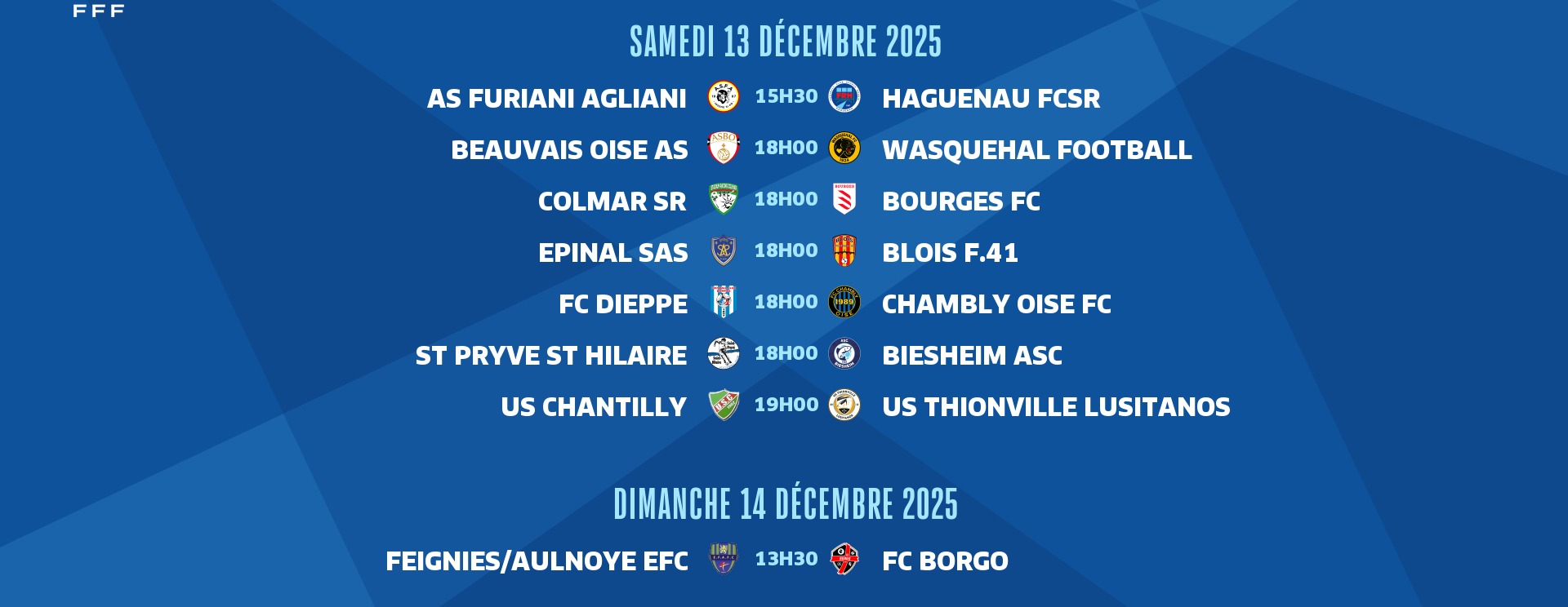 Cette 13e journée se poursuit samedi avec des matches programmés à 15h30, 16h00, 17h00, 18h00 et 19h00. Et une dernière rencontre, Feignies-Aulnoye face à Borgo (groupe B), aura lieu dimanche à 13h30.