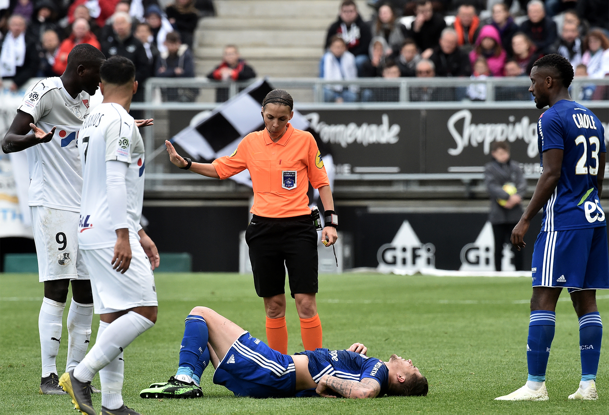 Promue en Ligue 1 par le Comité exécutif de la FFF, Stéphanie Frappart entre dans l’histoire de l’arbitrage français en dirigeant la rencontre Amiens-Strasbourg, le 28 avril 2019. (Photo François Lo Presti/AFP)