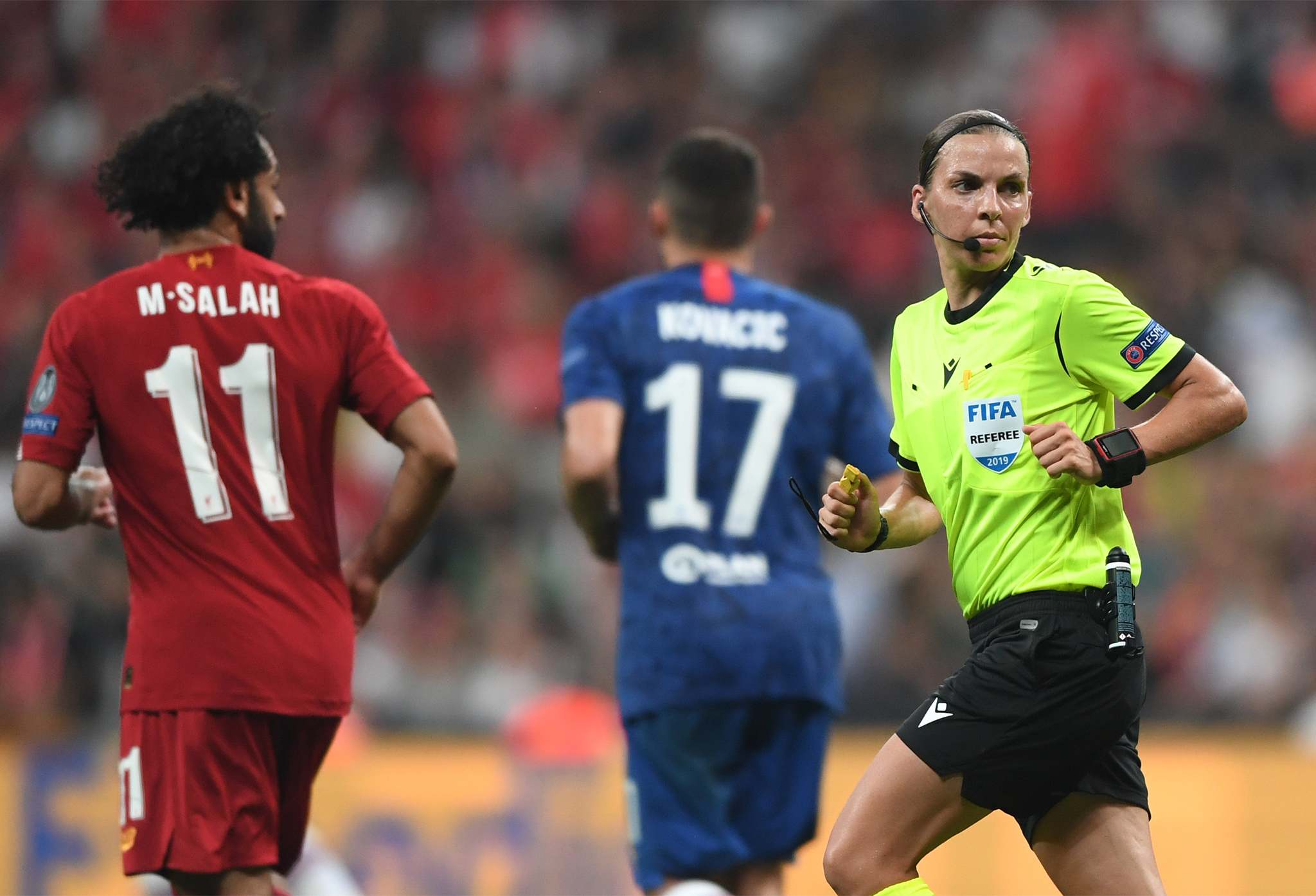 Stéphanie Frappart en action lors de la finale de la Supercoupe de l’UEFA 2019 entre Chelsea et Liverpool. L’acte 3 d’une année 2019 exceptionnelle pour la Française. (Photo Ozan Kose/AFP)