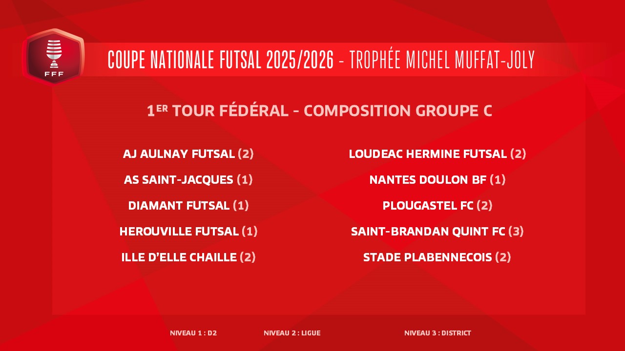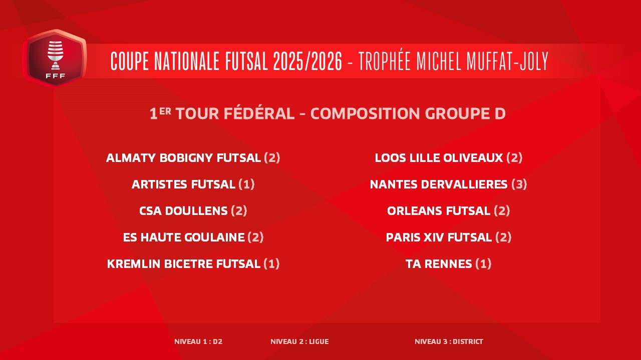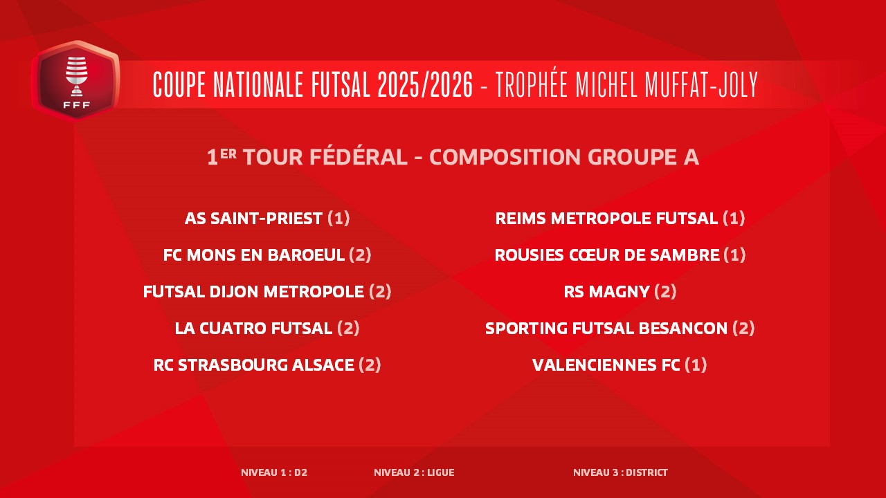 Voici les groupes pour le tirage au sort du 1er tour fédéral de la Coupe Nationale Futsal-Trophée Michel Muffat-Joly qui aura lieu ce mercredi 17 décembre à la FFF (12h00, en direct sur YouTube FFF).