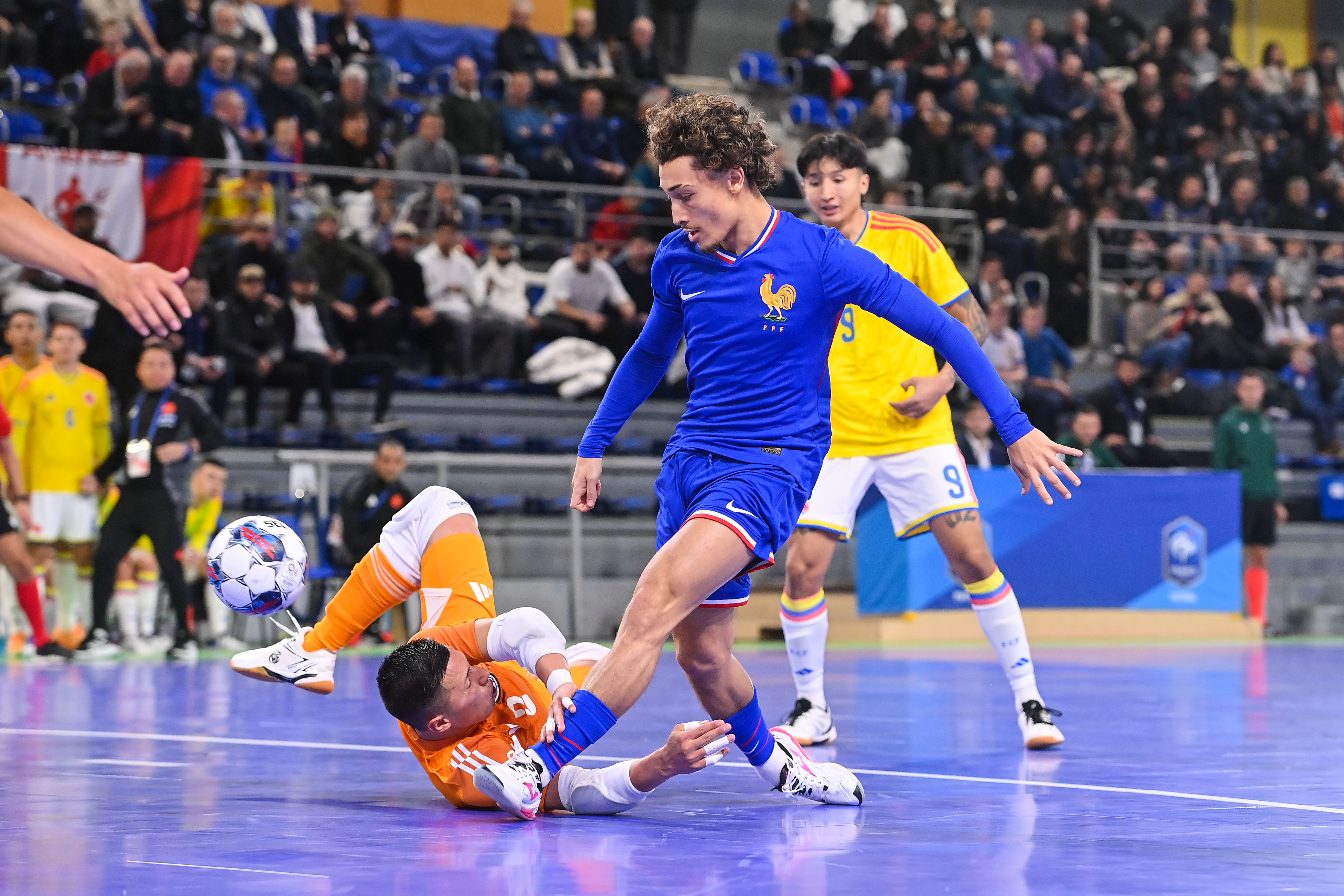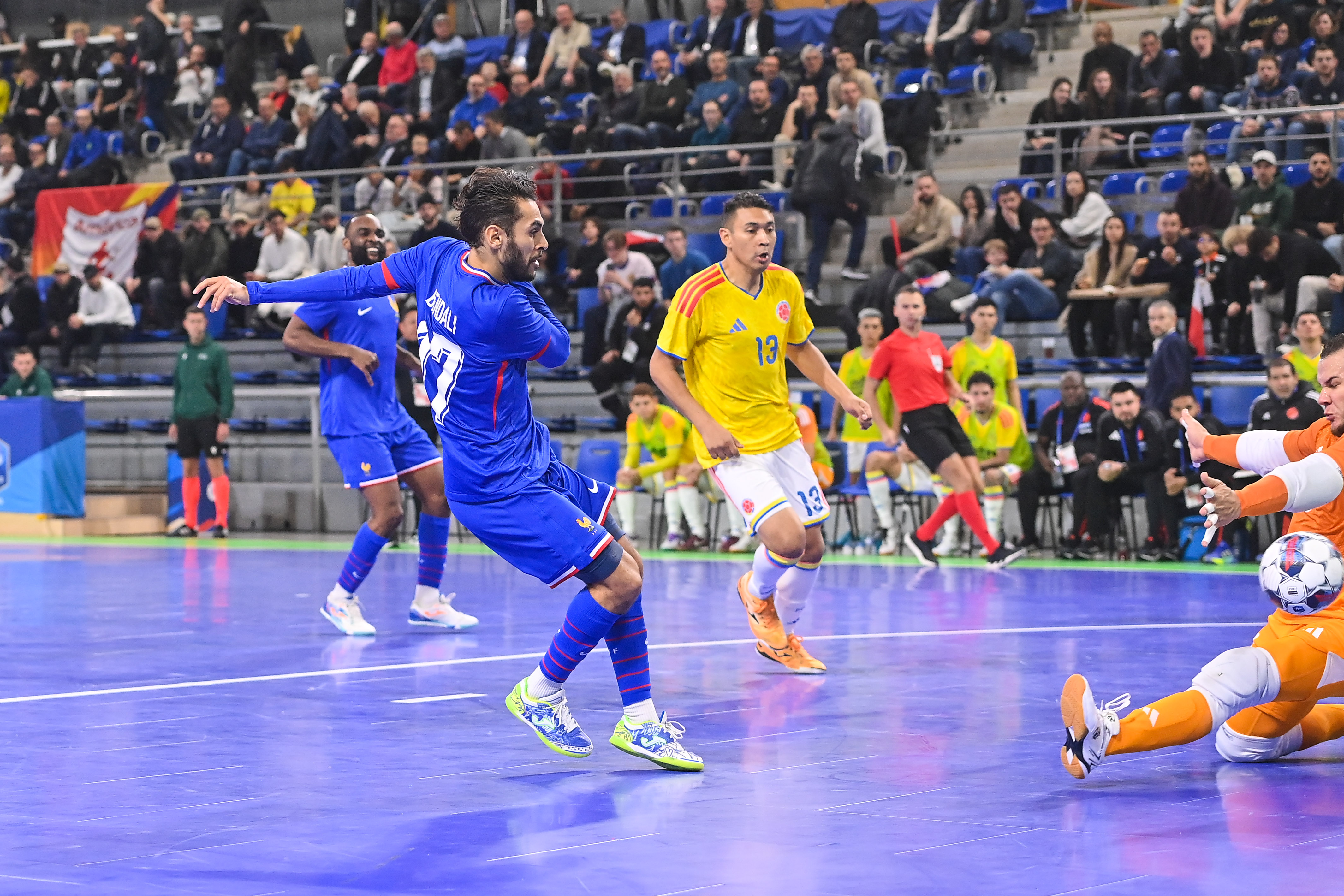 Les Bleus ont rapidement concrétisé en profitant d’un contre son camp de Ronald Solorzano (3e), avant de maîtriser les débats sans être mis en danger. Une erreur défensive profitant à Amin Benslama (8e) et une inspiration de pur pivot signée Arthur Tchaptchet (12e) vont leur permettre de creuser l’écart. Les Colombiens sont parvenus à rester dans la rencontre en réduisant la marque peu avant la pause, sur un coup franc de Cristian Neme (18e) sanctionnant la sixième faute collective tricolore.