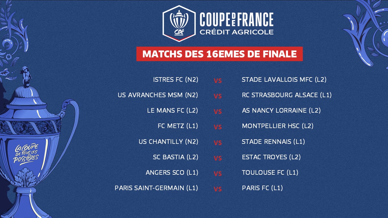 L’US Avranches MSM (N2), qui a réalisé l’un des exploits des 32es en sortant le Stade Brestois (L1), devra de nouveau écarter une L1, le RC StrasbourG, si elle veut poursuivre sa route. Quant au Paris SG, tenant du trophée, il recevra le Paris FC (L1) pour un derby de la capitale.