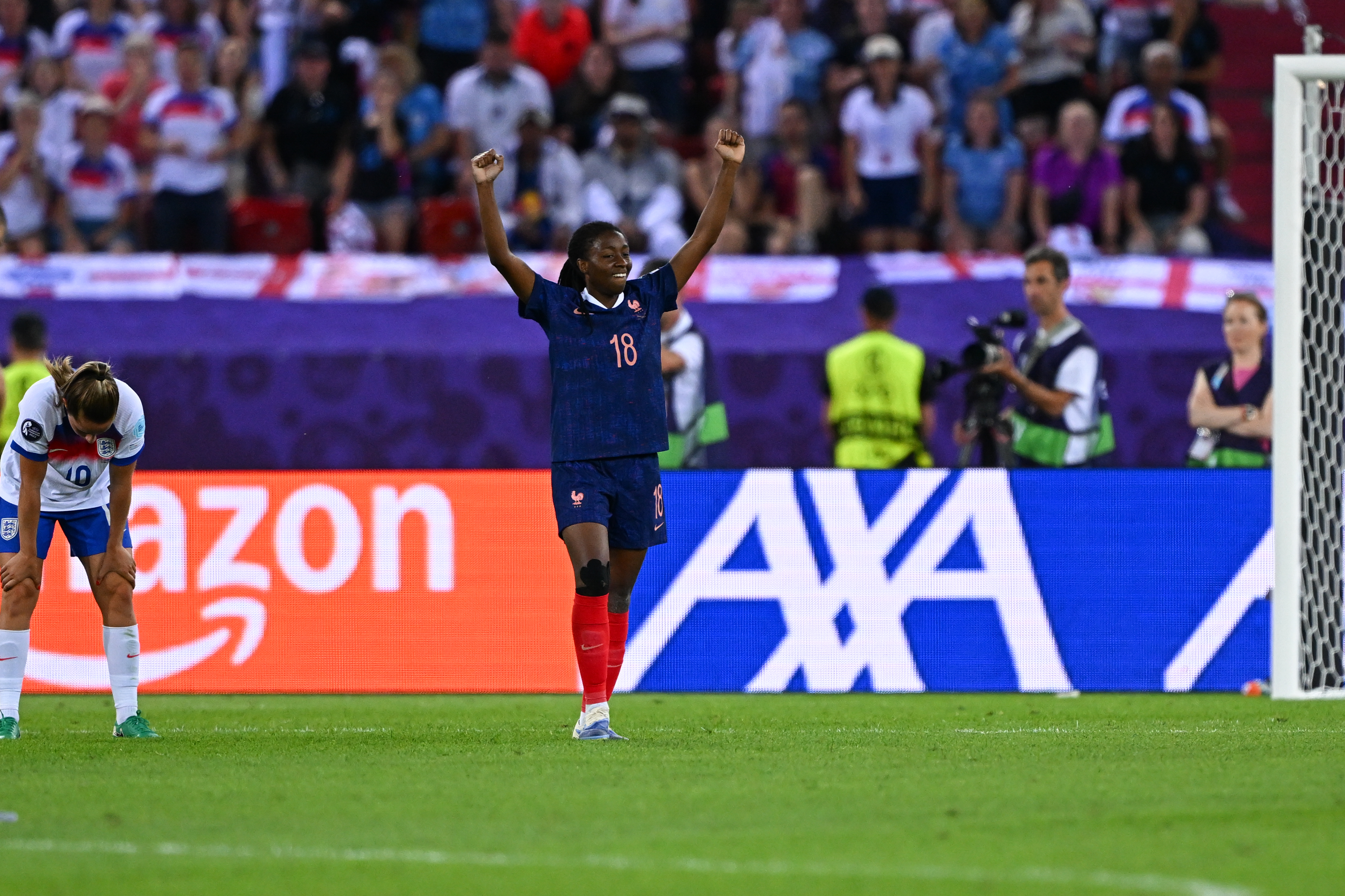 Oriane Jean-François, bras levés, qui contraste avec Ella Toone, mains sur les cuisses, lors de l'entrée en lice des Bleues à l'Euro 2025 face à l'Angleterre, où la milieu française avait brillé (photo Baptiste FERNANDEZ / ICON SPORT).