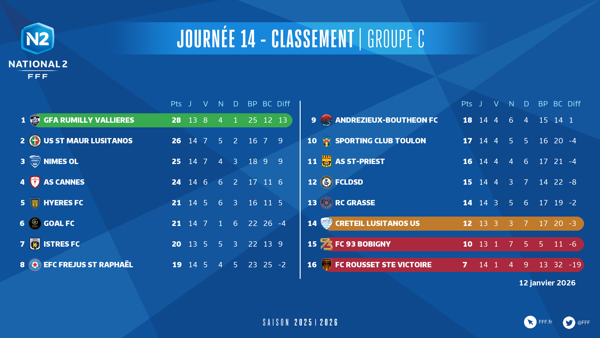 Dans le groupe C, la bonne opération est à mettre au crédit du RC Grasse, qui se donne un peu d'air au classement après son succès sur le FC Limonest Saint-Didier (3-1). Mais ce n'est pour le moment qu'un répit car l'US Créteil et le FC Bobigny n'ont pas joué.