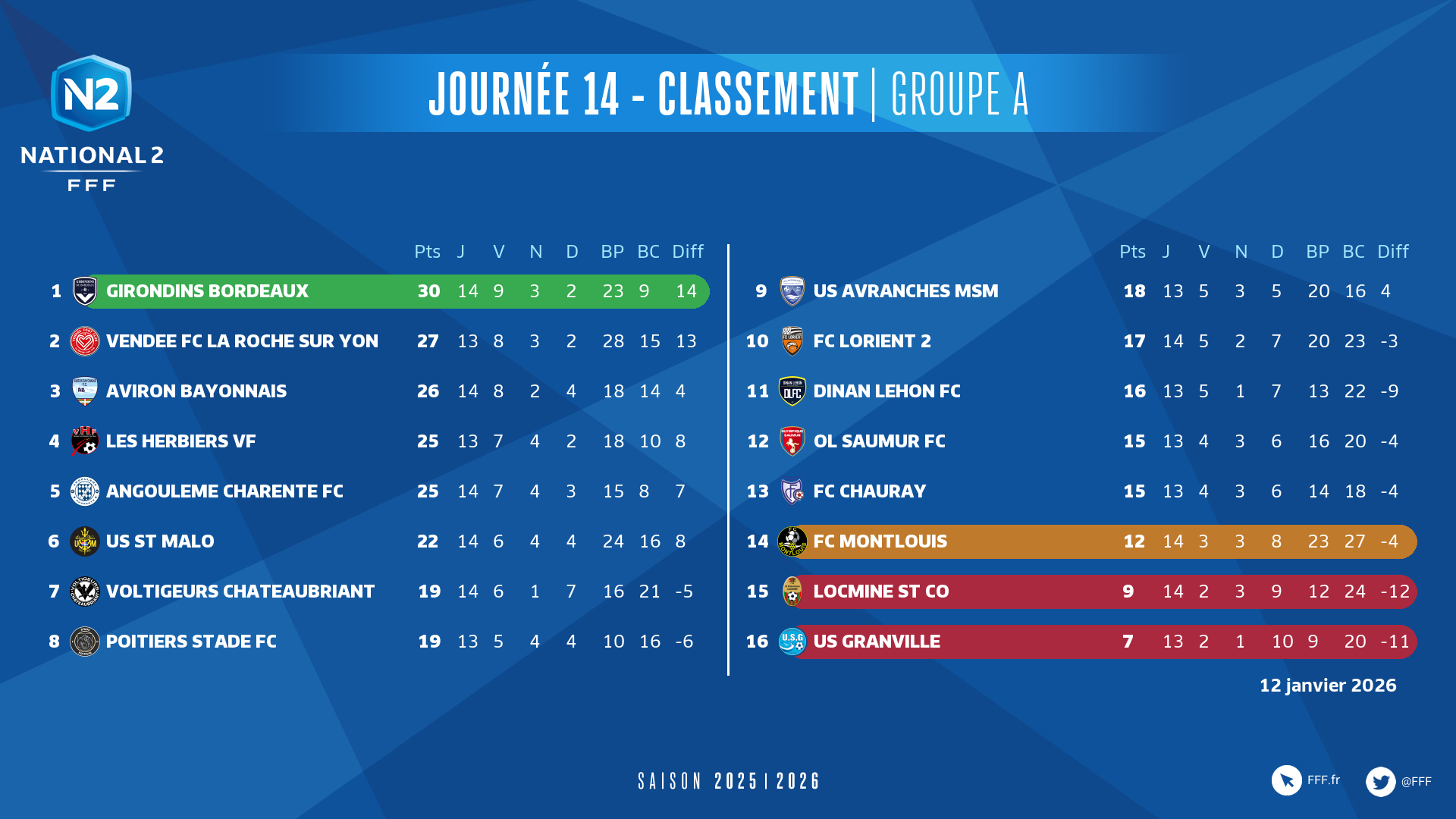 Quatre matchs reportés dans le groupe A, sept dans le groupe B, le plus "touché" par ces reports, et deux dans le groupe C, le groupe dit "du Sud" : la 14e journée de National 2 a vu plus de la moitié des matchs être reportés.