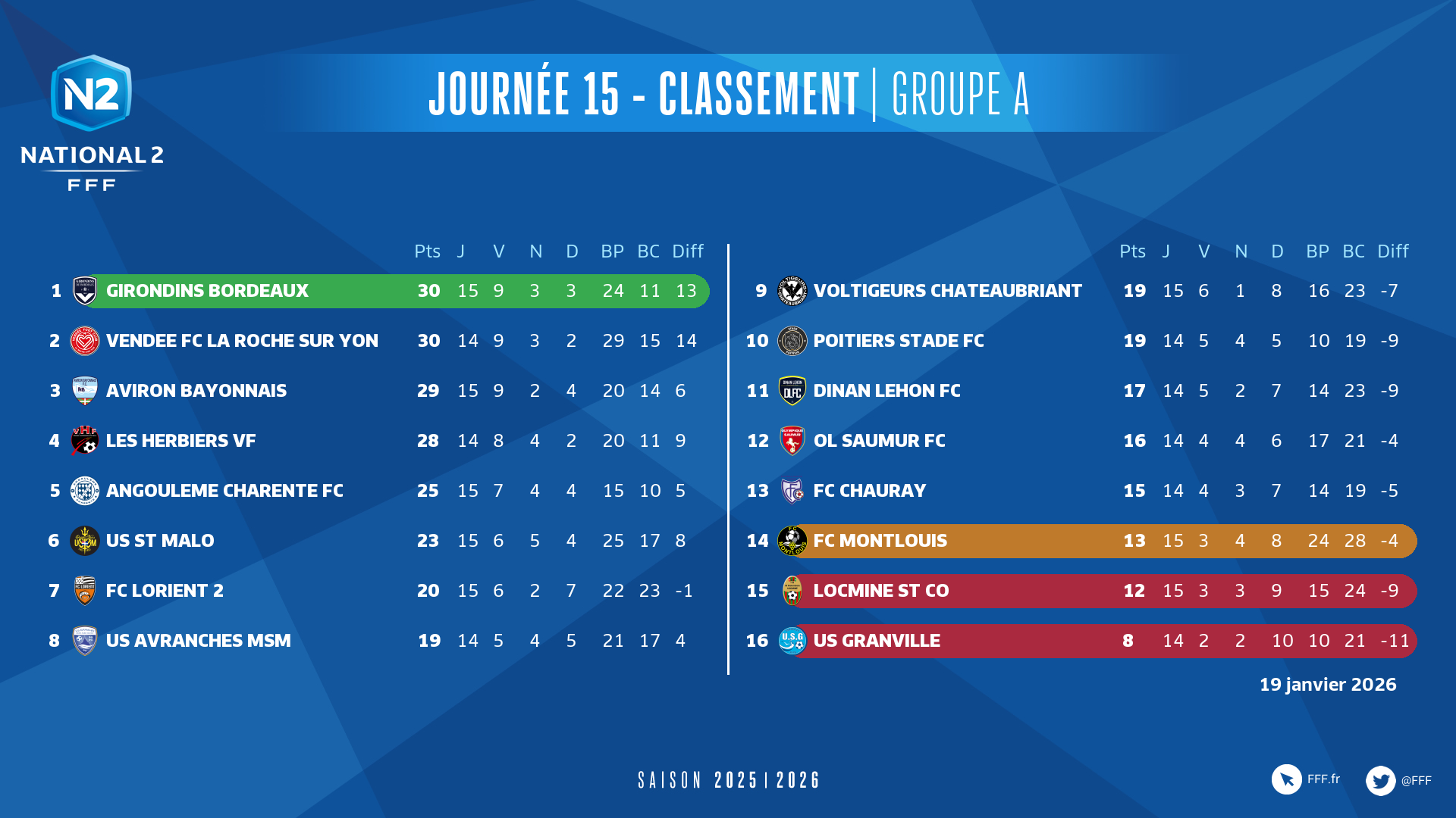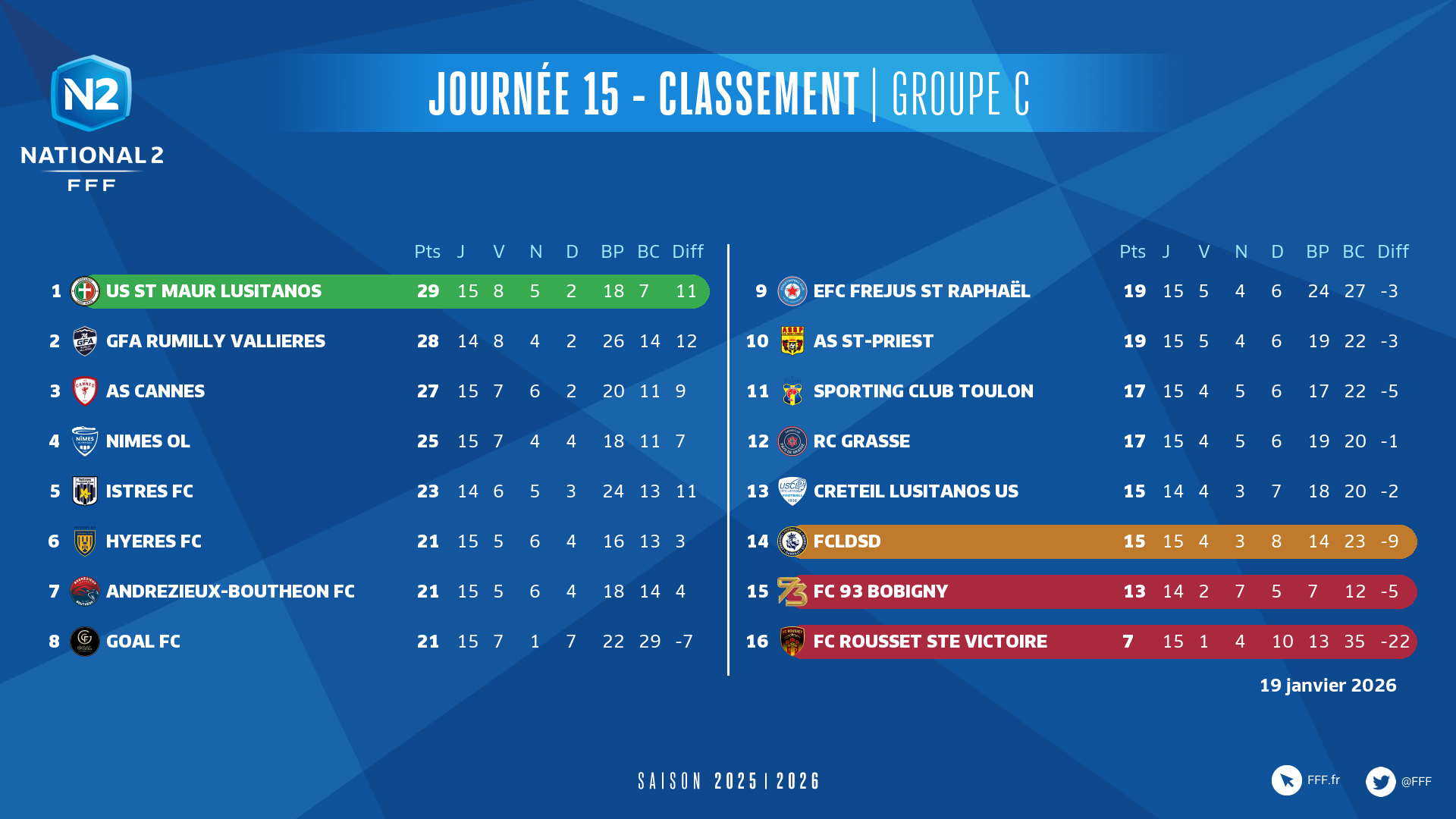 Un changement de leader pour ce début d'année : Saint-Maur (groupe C) prend la tête aux dépens de Rumilly Vallières à l'issue de la 15e journée du samedi 17 janvier.