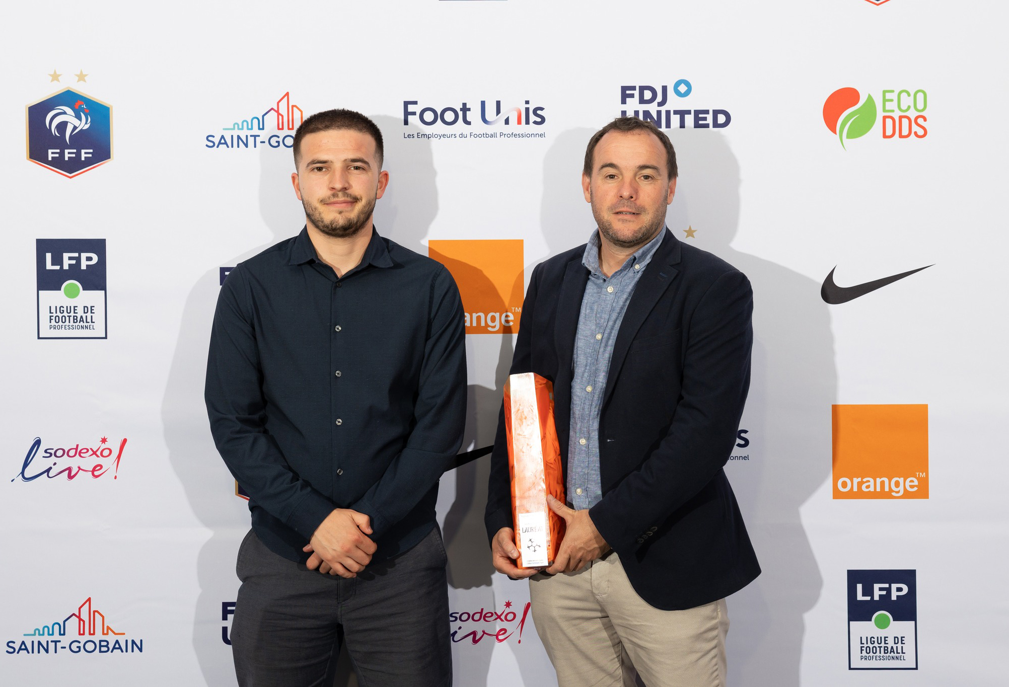 Mathieu Amat, responsable des partenariats et de la communication du Labourdins Foot d’Ustaritz, et Frédéric Degert, son président, avec le trophée récompensant l’action du club (photo Labourdins Foot d’Ustaritz).
