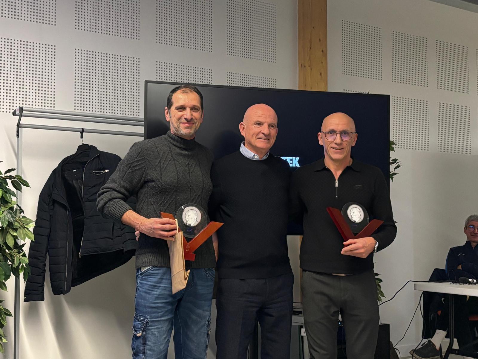 Guy Stéphan accompagné de Jean-Claude Cousinier et Philippe Belmonte, lauréats des Trophées Georges-Boulogne remis par le District du Tarn (photo FFF).