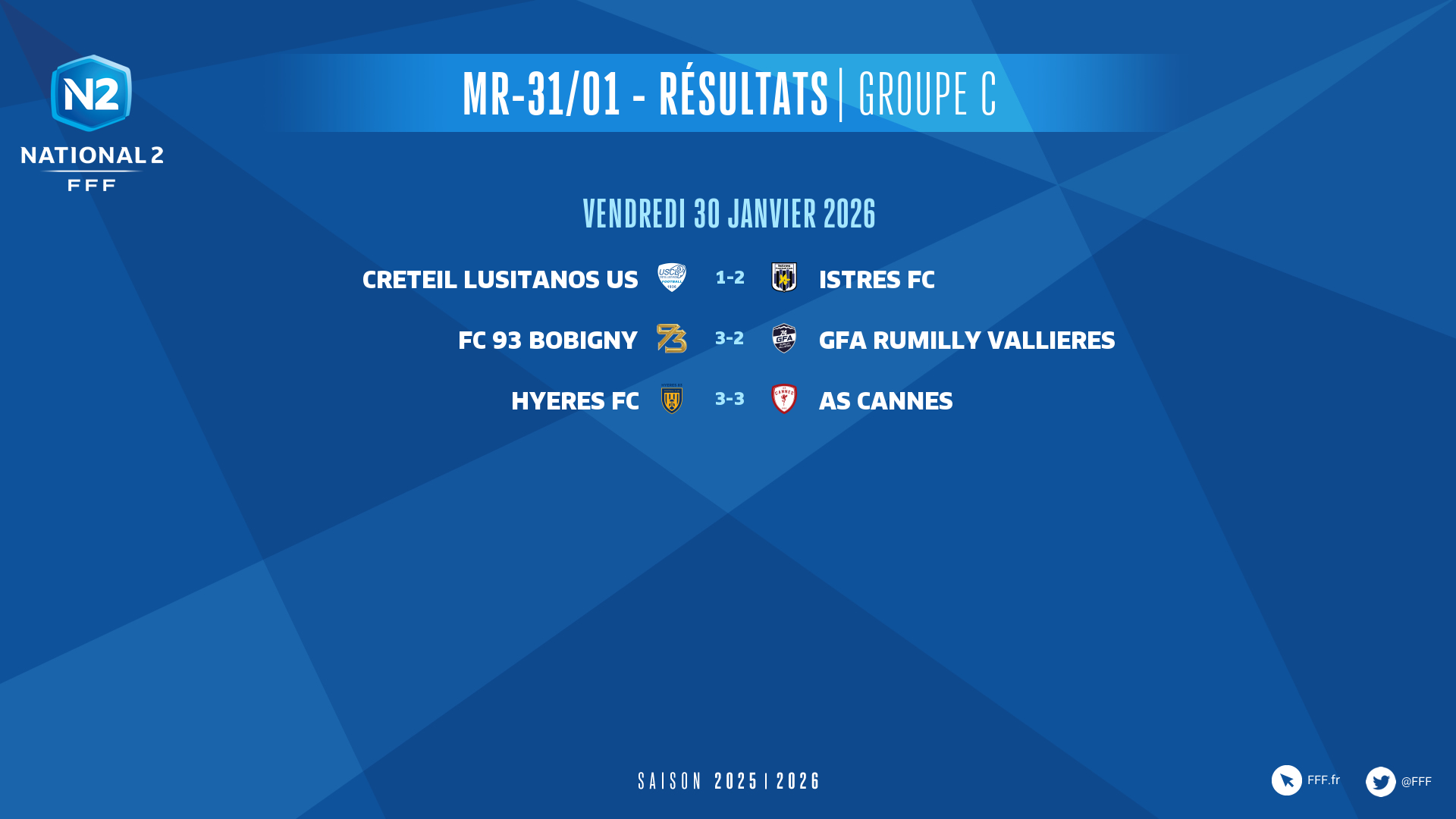 - J14 : FC 93 Bobigny (13e, 17 pts) - GFA Rumilly Vallières (2e, 31 pts) 3-2