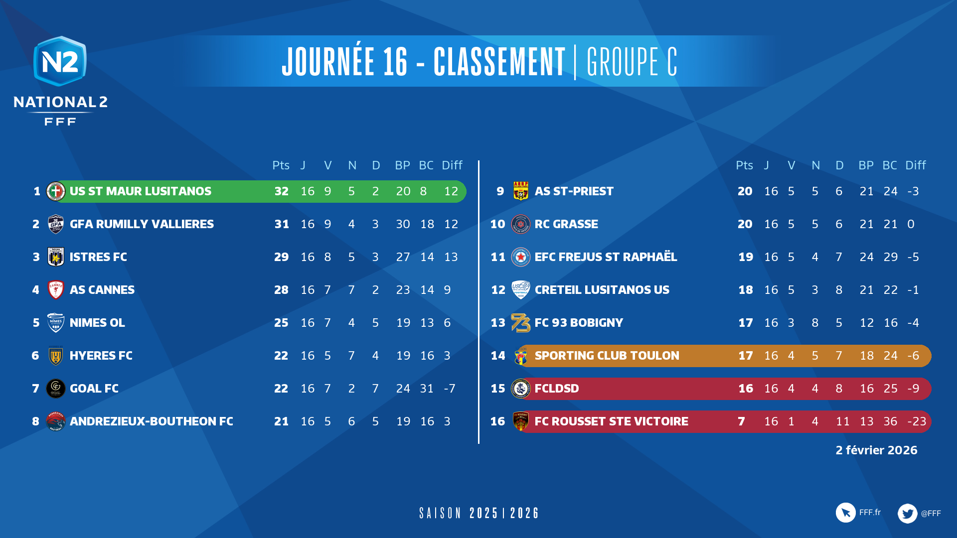 Si certains avaient également parié sur un changement de patron dans le groupe C, ils ont perdu leur mise : Saint-Maur garde la main (32 pts) après la défaite de Rumilly Vallières, son dauphin, à Bobigny (3-2). Juste derrière, Istres, victorieux à Créteil (2-1), s'est hissé au troisième rang, en lieu et place de Cannes tenu en échec à Hyères (3-3), en match en retard de la 16e journée.