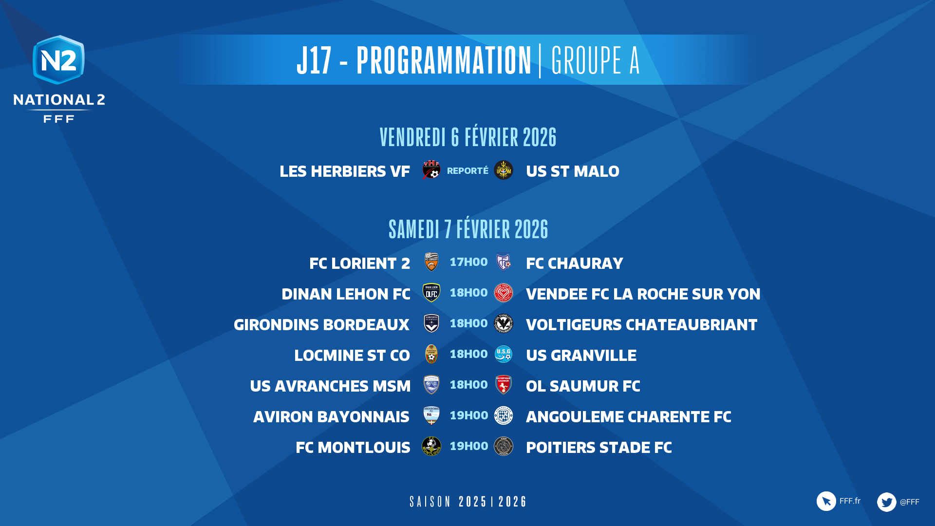Deux matches sont avancées au vendredi 6 février. Initialement prévue ce vendredi, la rencontre entre Les Herbiers VF et l'US Saint-Malo a été reportée en raison des intempéries.