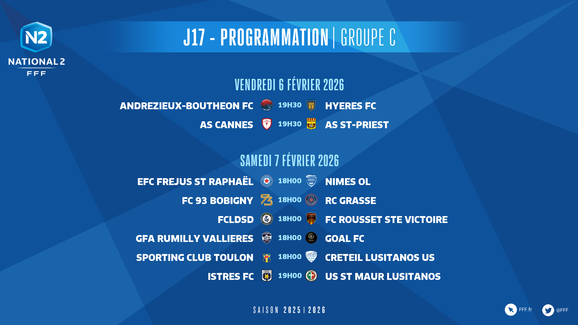 Dans le groupe C, l'AS Cannes accueille l'AS Saint-Priest (19h30) et pourrait revenir à un point de la première place en cas de succès. Dans le même temps, Andrézieux-Bouthéon accueille Hyères.
