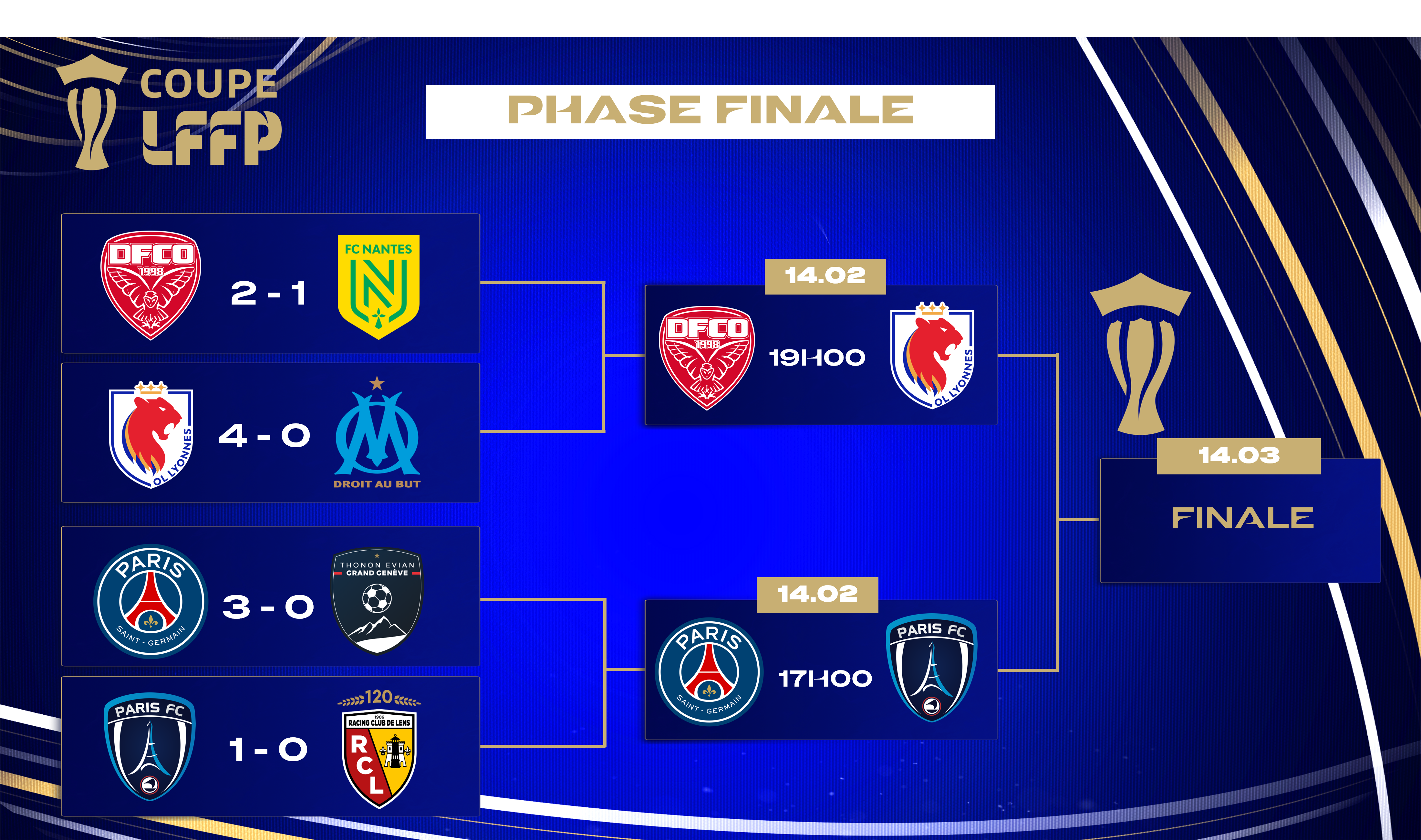 Les quarts de finale de la Coupe LFFP ont livré leur verdict, et ils ont été favorables aux équipes qui recevaient. Quatre victoires et autant de qualifications pour les deux clubs de Paris, aux dépens de Lens et Thonon Evian, qui s'affronteront samedi prochain dans un derby qui s'annonce palpitant (17h00), mais aussi pour l'OL Lyonnes qui s'est facilement défait de l'OM. Les championnes de France en titre défieront samedi (19h00) Dijon, surprenant tombeur du FC Nantes, pour une place en finale de la compétition, prévue le 14 mars prochain à Abidjan (Côte d'Ivoire).