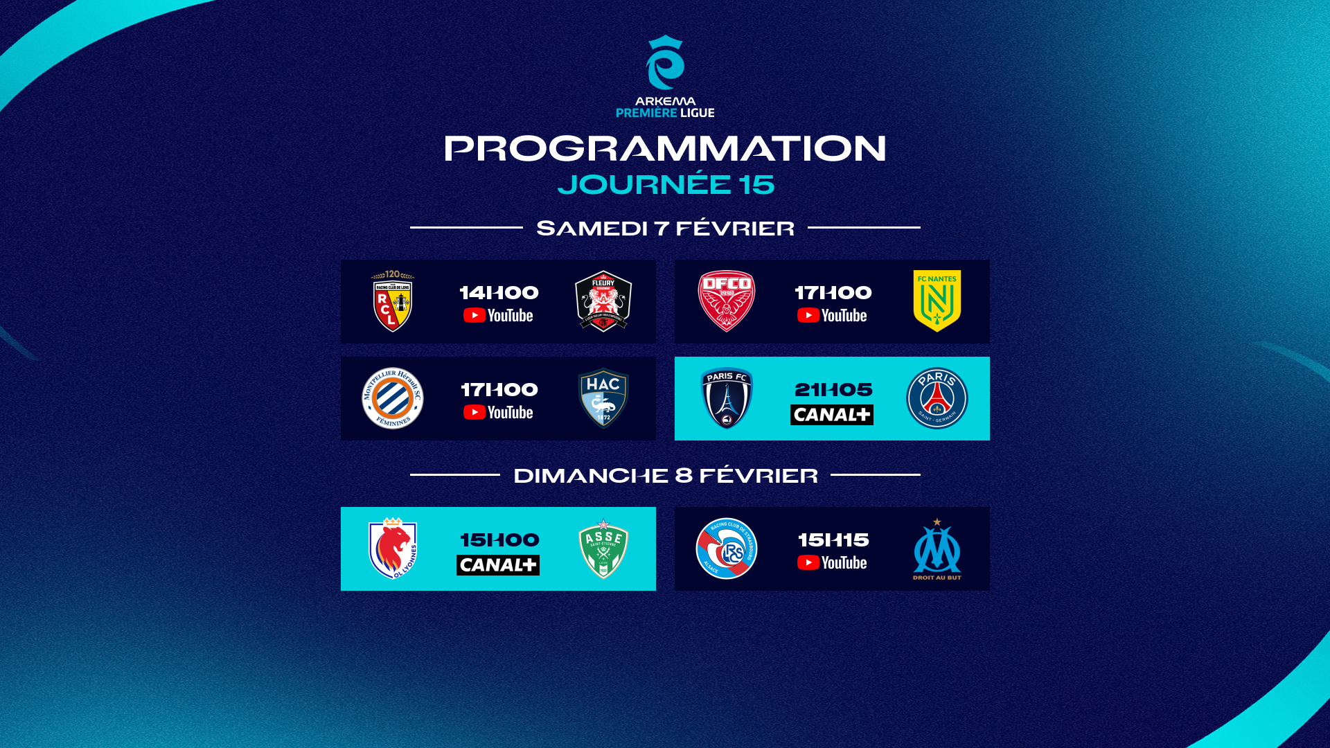 Les quatre autres rencontres de la 15e journée du championnat seront retransmises en direct par la chaîne YouTube Arkema Première Ligue : trois le samedi (14h00 et 17h00), la dernière - Strasbourg-Marseille - le lendemain pour clore cette J15 (15h15, voir détails ci-dessous).