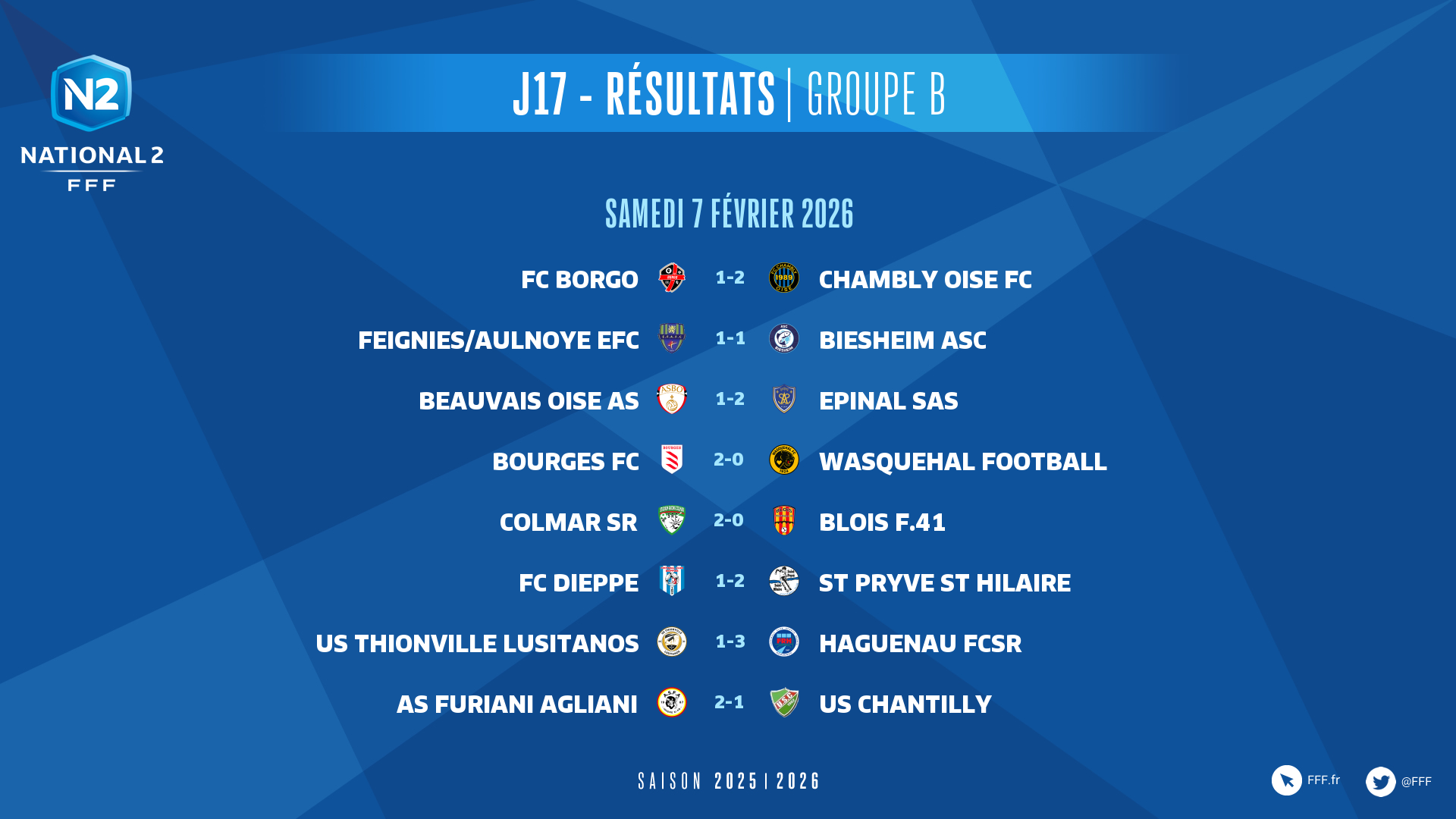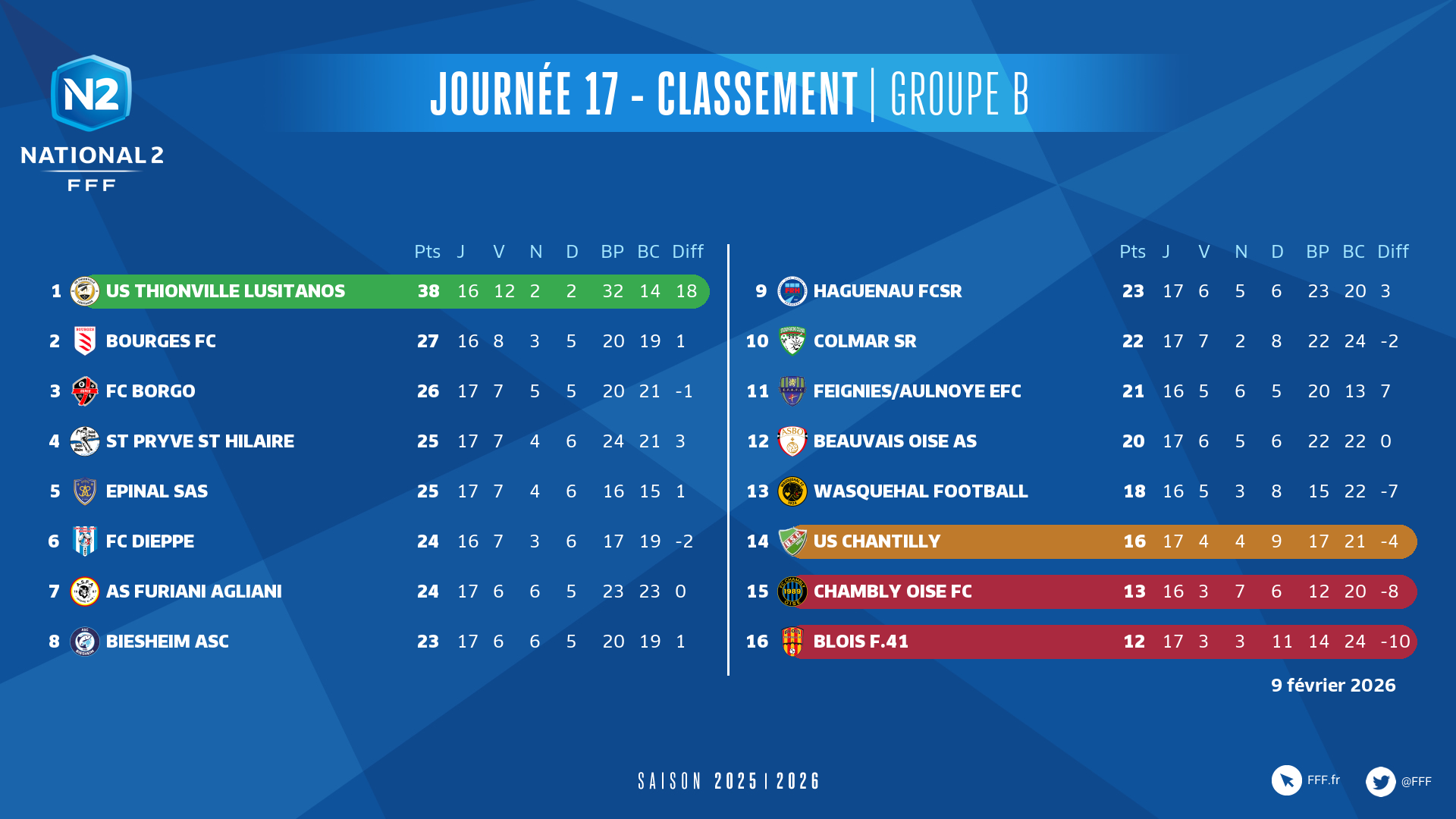 Dans le groupe B, le leader incontesté, l'US Thionville Lusitanos, s'est lourdement incliné chez lui face au FCSFR Haguenau (1-3). Les Mosellans, qui ont un match en retard et restaient sur deux résultats nuls, n'avaient plus perdu depuis la journée inaugurale à Chambly, le 16 août ! La série de 14 matches sans défaite s'est donc achevée. Ce revers n'a pas d'incidence au classement : l'équipe de Julien François conserve 11 points d'avance sur le 2e, le FC Bourges, qui a repris sa marche en avant en s'imposant face à Wasquehal Foot (2-0). Le match en retard Bourges - Thionville du 28 février devrait valoir son pesant d'or.