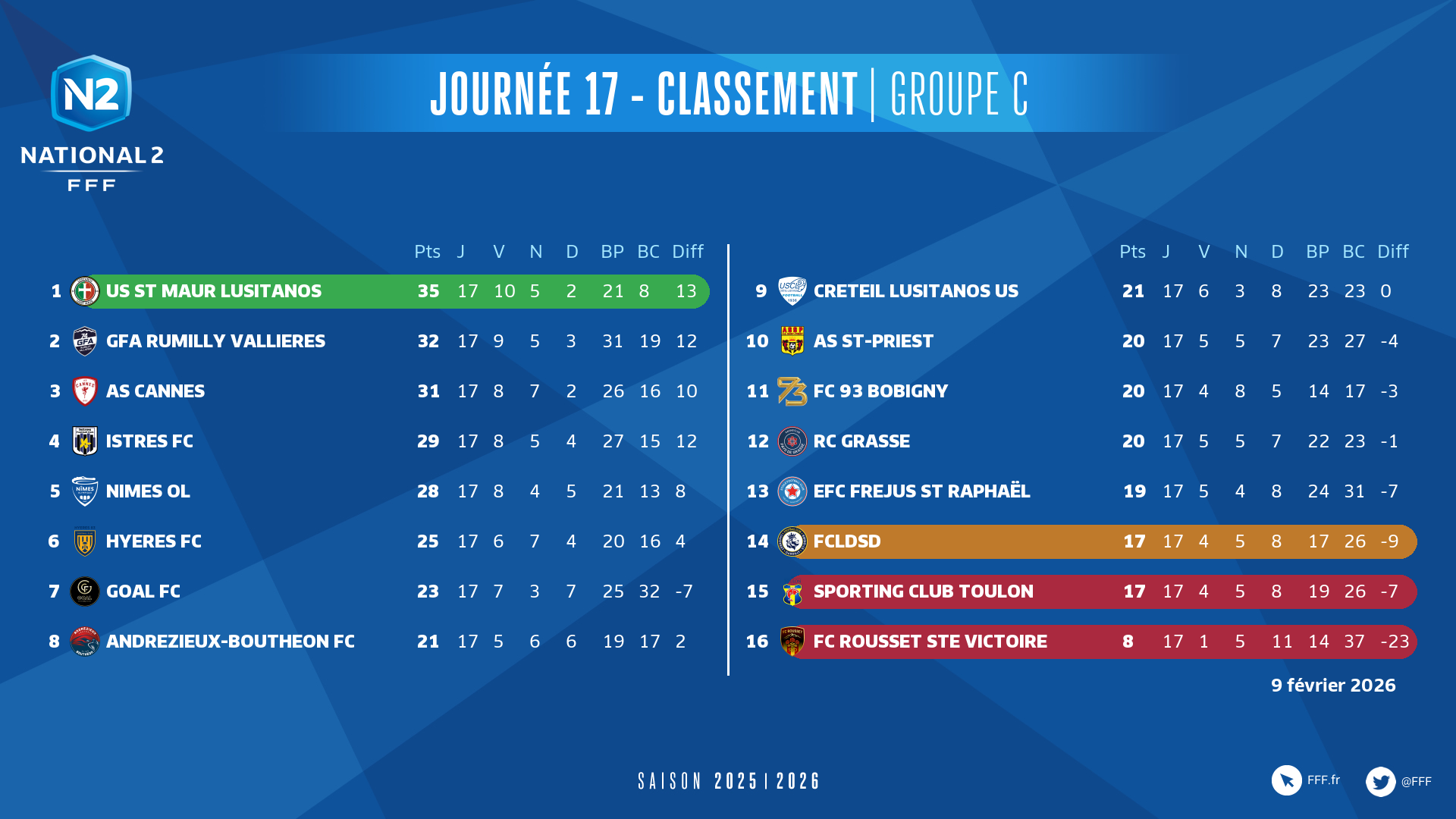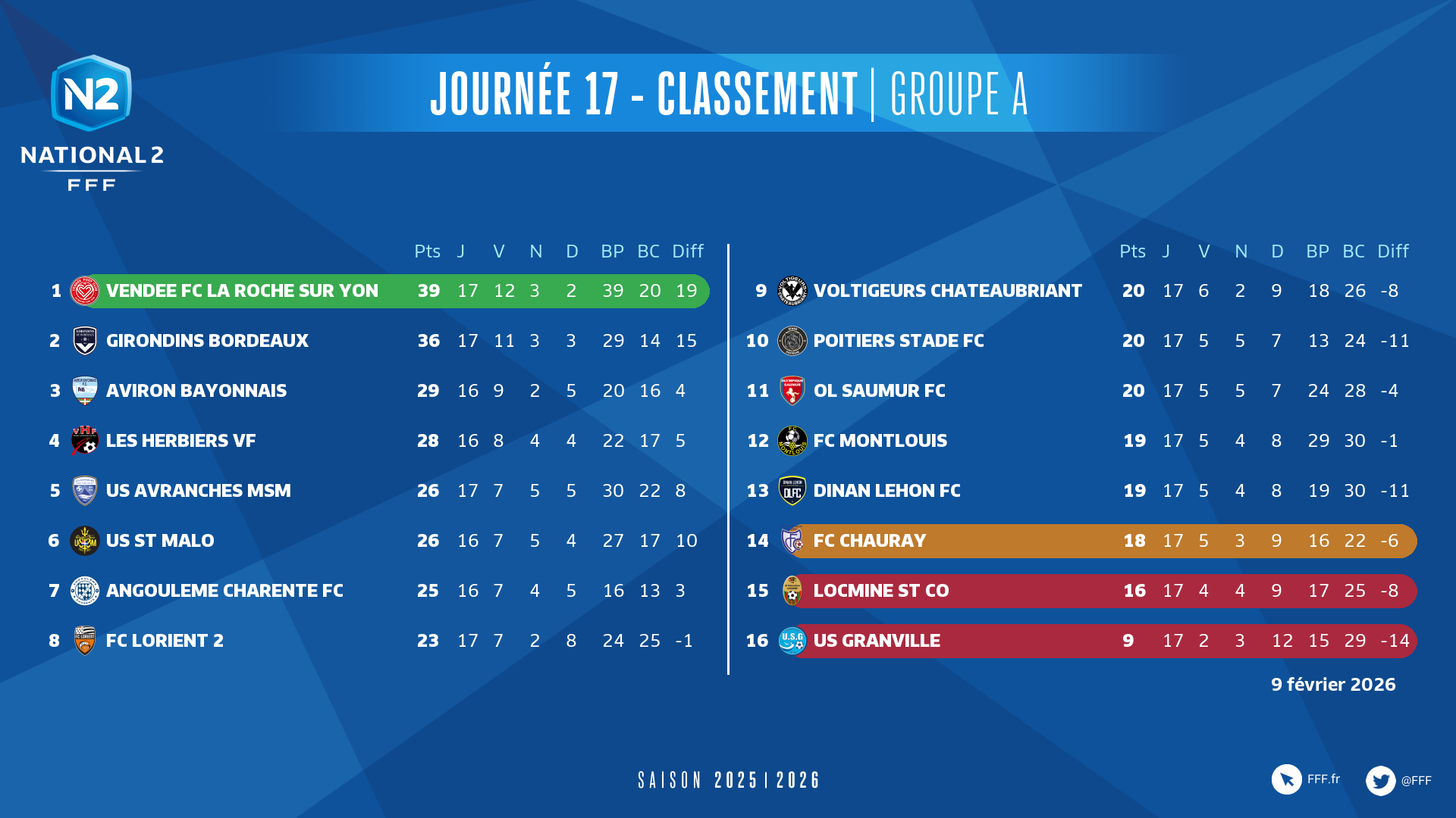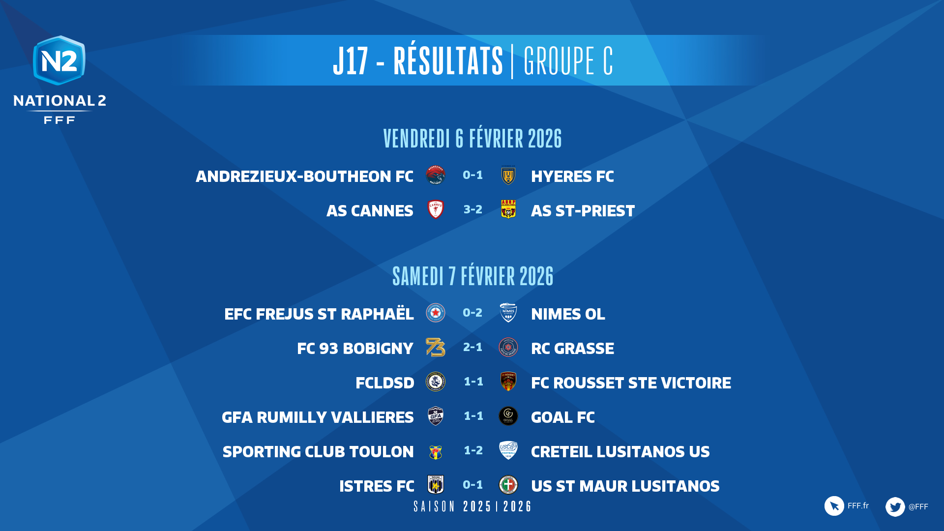 Le résumé de la 17e journée de National 2 du samedi 7 février. En tête, la Roche (groupe A) et Lusitanos Saint-Maur (groupe C) l'ont emporté mais pas Thionville Lusitanos (groupe B), qui enregistre sa première défaite depuis la journée inaugurale.