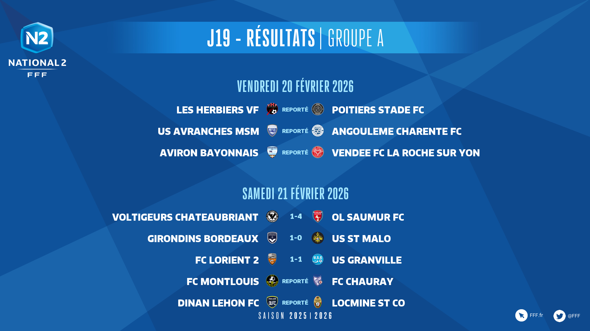 Dans le groupe A, où seulement trois matchs sur huit ont pu être disputés, les Girondins de Bordeaux ont battu Saint-Malo pour s'emparer de la première place du groupe, Vendée Foot n'ayant pas joué. Granville, lanterne rouge, est allé prendre un point à Lorient (B) tandis que Saumur s’est imposé largement à Châteaubriant (4-1), un adversaire direct pour le maintien.