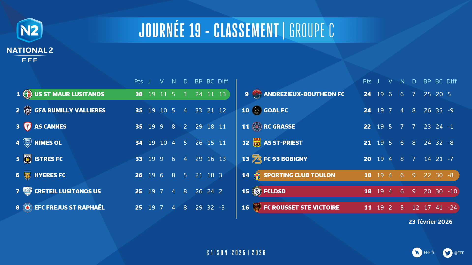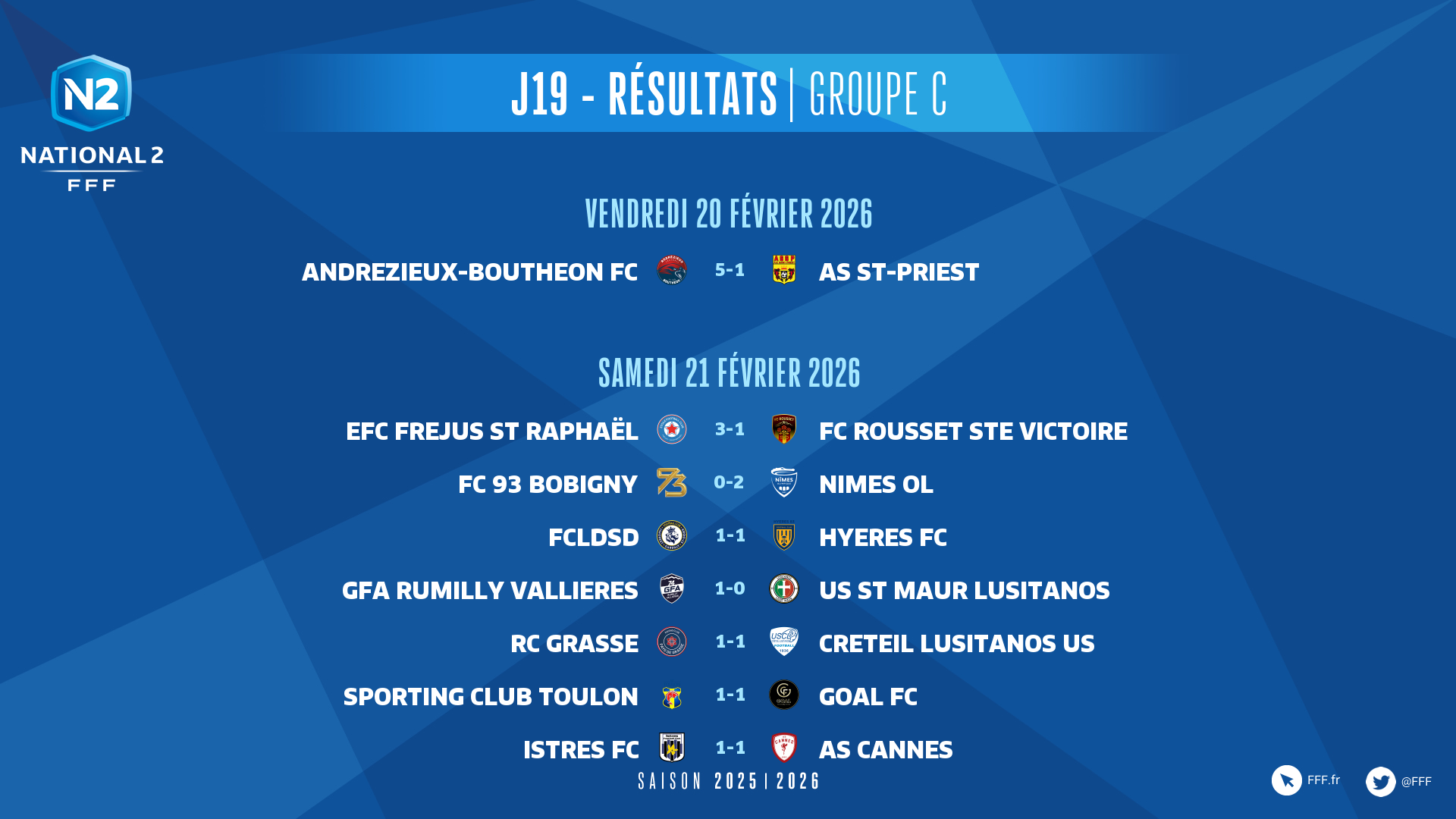 ► Bonnes opérations pour Fréjus Saint-Raphaël (2-1 devant le FC Rousset) et Andrézieux Bouthéon (5-1 contre Saint-Priest) qui s’éloignent de la zone dangereuse, profitant du fait qu’aucun des six derniers du classement n’a gagné.