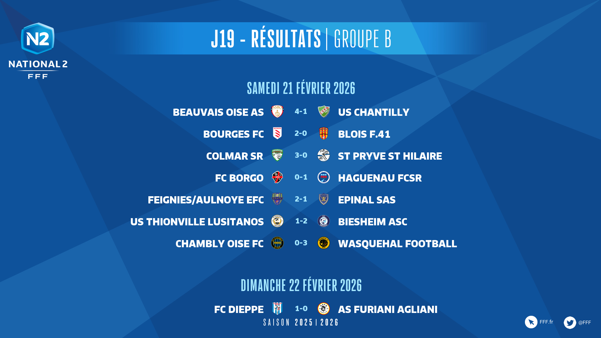 ► Le leader Thionville Lusitanos a été battu à domicile par Biesheim (1-2). Tout s'ést joué dans le dernier quart d'heure avec deux buts des visiteurs par Babou Seye (76e) et Anthony Decherf (84e), les locaux réagissant trop tard, par Muamer Aljic (90e+3). Thionville garde toutefois sept points d'avance sur Bourges FC, vainqueur de Blois Foot (2-0).