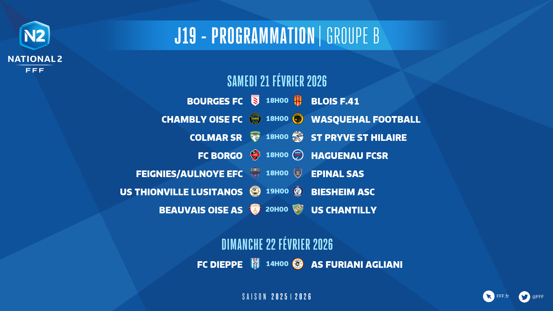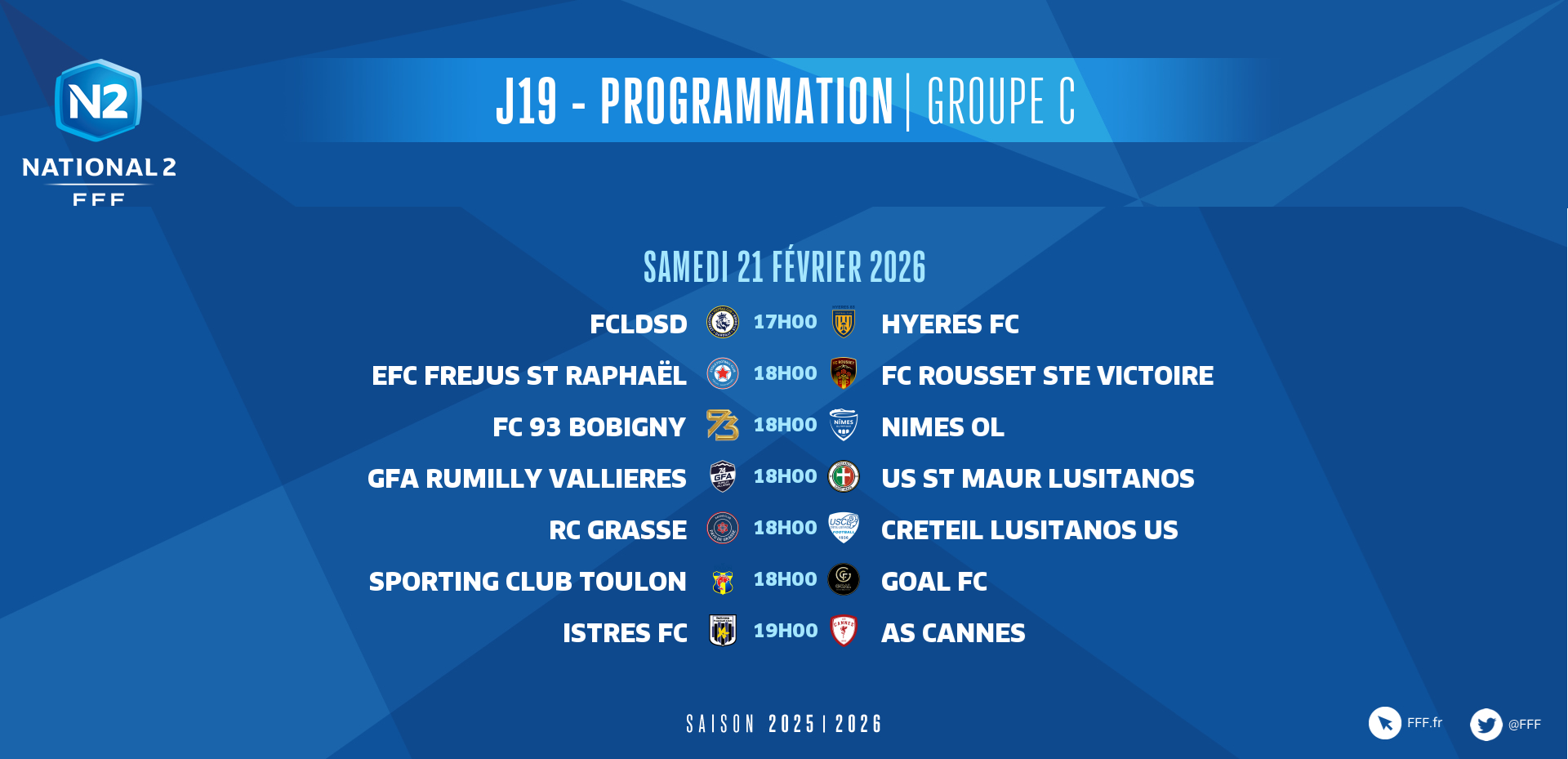 Les autres rencontres se disputeront ce samedi 21 février (coups d'envoi à 17h00, 18h00, 19h00 et 20h00), hormis celle opposant le FC Dieppe et l'AS Furiani Agliani (groupe B), en clôture dimanche (14h00).