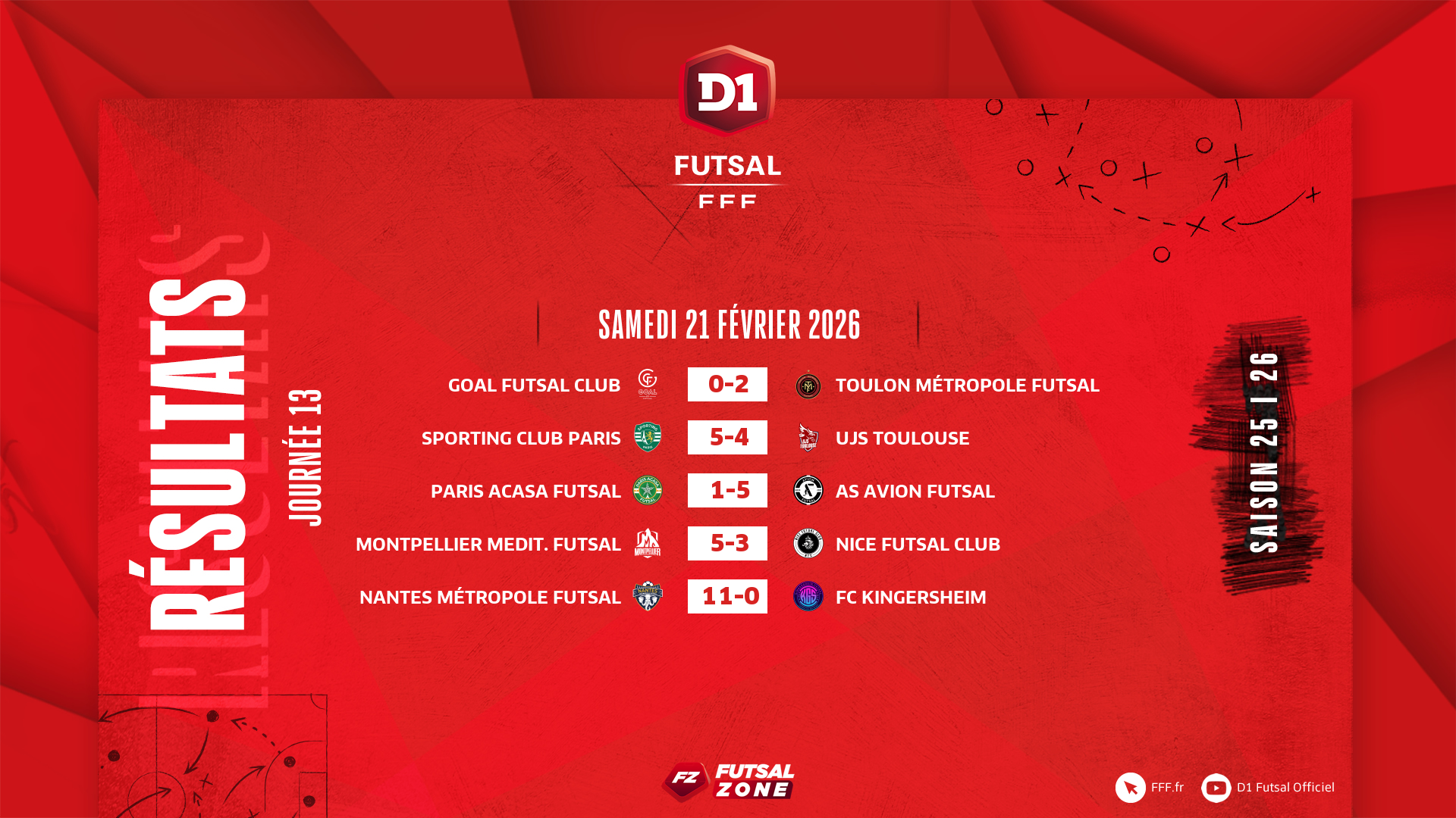 Il faut croire que la D1 Futsal, en pause depuis le 10 décembre dernier en raison de la trêve hivernale puis de l'Euro Futsal 2026, leur avait manqué. La fièvre du samedi soir s’est en effet emparée du championnat au regard du nombre de buts inscrits (36, dont 22 à domicile, plus haut total de la saison). Une belle moyenne (7,2 par match) est ainsi à recenser et Mustapha Rabou, le meilleur buteur de l'élite, a évidemment participé à la fête en signant un doublé - 19e et 20e but cette saison - lors du succès d'Avion au Paris ACASA (1-5). Nantes a largement dominé Kingersheim (11-0) tandis que Montpellier a battu Nice (5-3) pour s'emparer de la troisième place occupée par le GOAL FC, défait par Toulon (0-2).