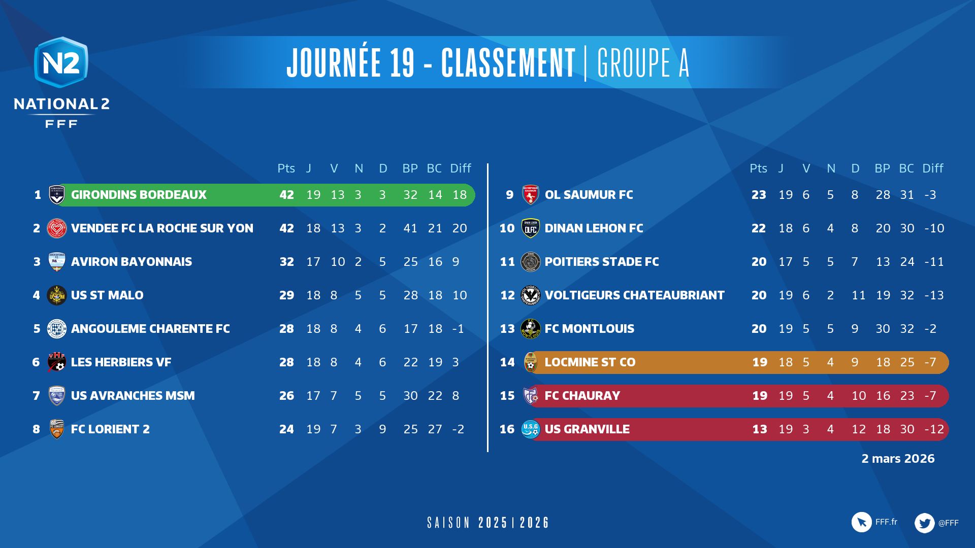 Rendez-vous le week-end prochain (vendredi 6, samedi 7 et dimanche 8 mars) pour la 20e journée de championnat.