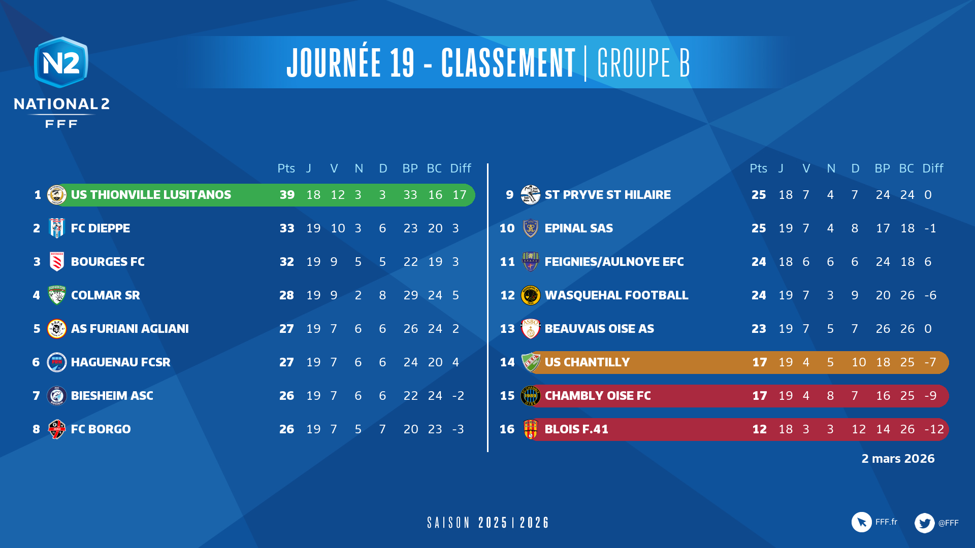 Dans le groupe B, le choc entre deux premiers du classement, Bourges et Thionville, est resté stérile (0-0), ce dont les Lorrains (1er, 39 pts) se satisfont probablement car ils conservent une belle avance. Mais pas les Berruyers (3es, 32 pts) qui voient Dieppe leur passer devant (2e, 33 pts) au bénéfice de sa large victoire à Wasquehal (4-1) avec deux doublés de Claude Atheba (3e, 63e) et Hatim Far (89e, 90e). La soirée a aussi souri à Chambly qui a dominé Feignies-Aulnoye (4-2) pour empocher trois points importants pour le maintien (15e, 17 pts).
