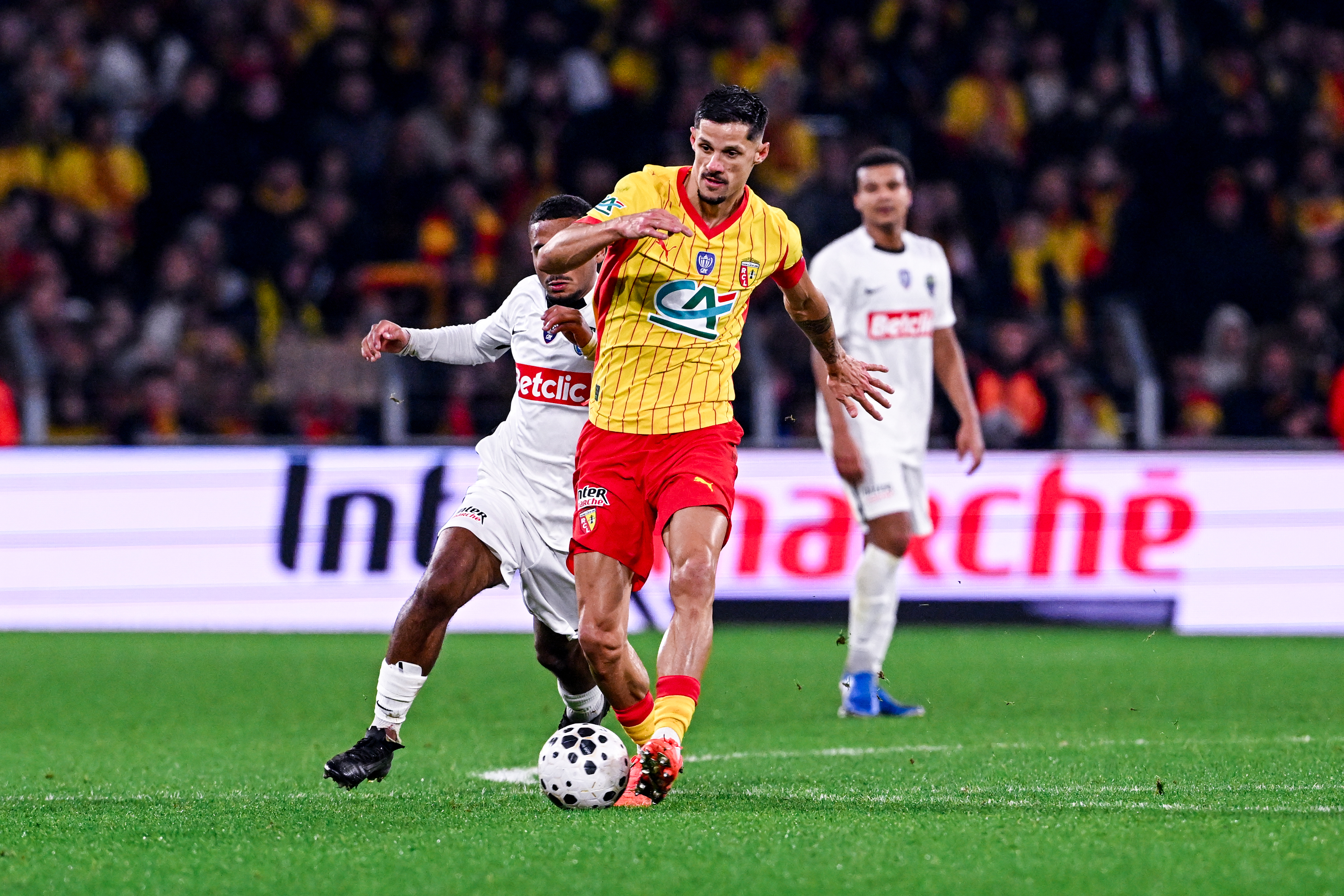 Florian Sotoca a toujours été titulaire depuis le début du parcours du RC Lens en Coupe de France Crédit Agricole, le brassard de capitaine au bras comme ici face à Feignies-Aulnoye (N2, 3-1, le 19 décembre 2025) lors des 32es de finale (photo Baptiste FERNANDEZ / ICON SPORT).