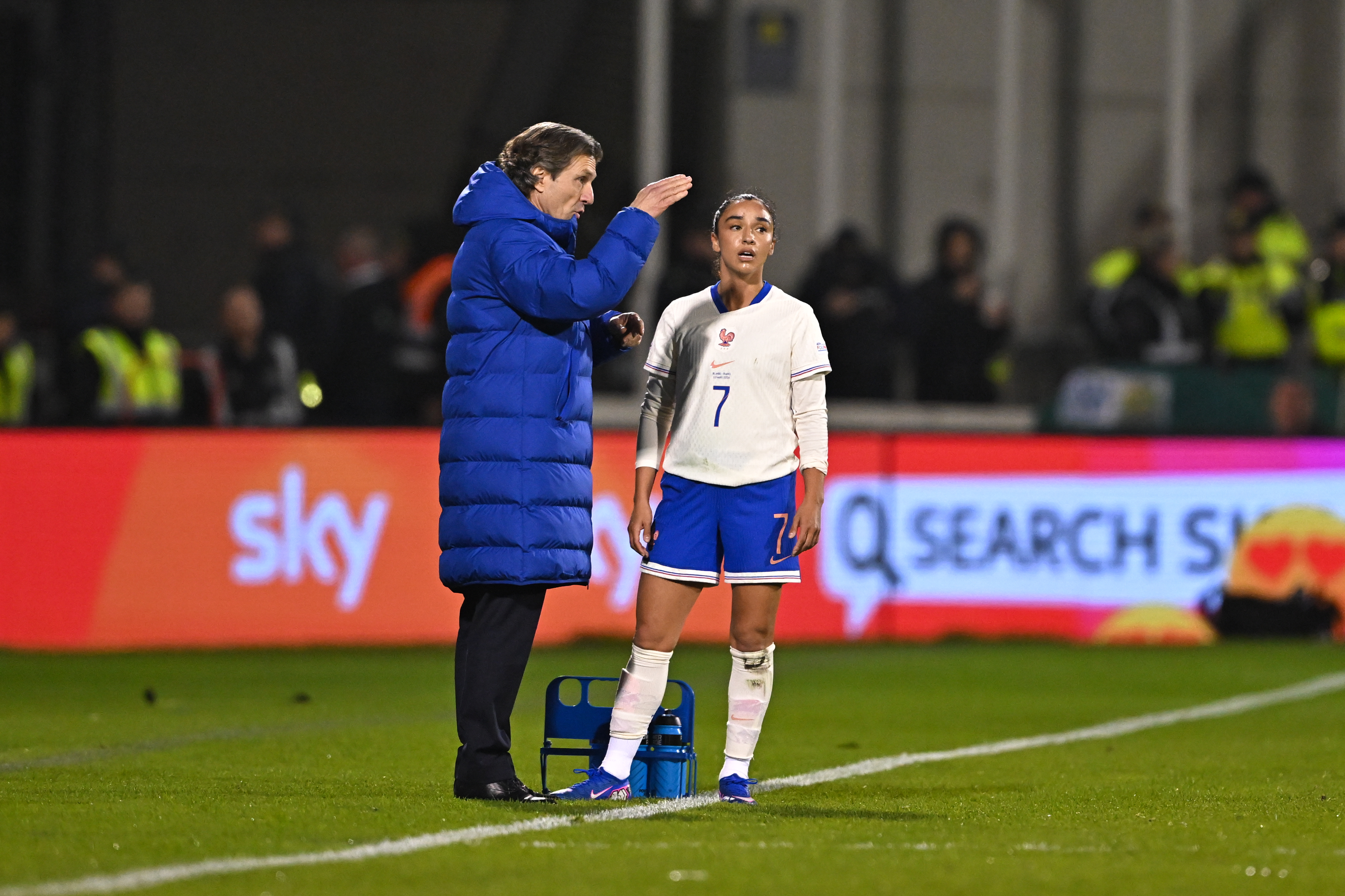 Laurent Bonadei échange avec Sakina Karchaoui (photo Baptiste FERNANDEZ / ICON SPORT).