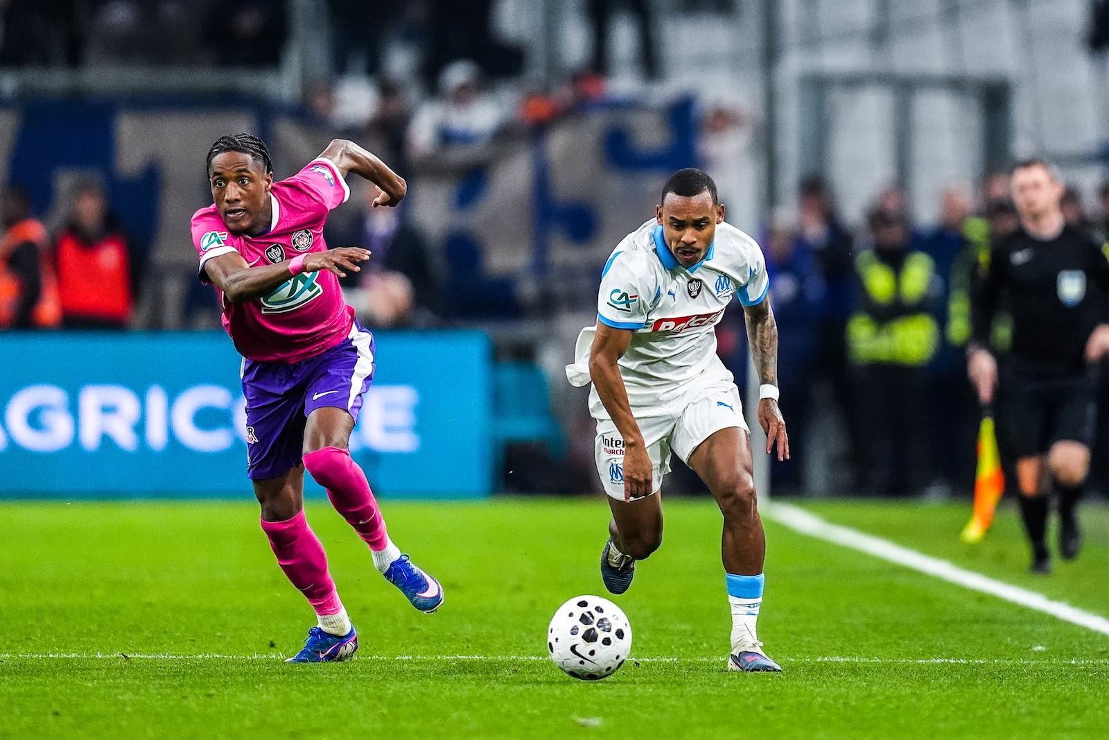 La séance de tirs au but jouée au pied du virage Nord a été plus brève qu'à Lorient. Les cinq premières frappes finissaient toutes au fond et Toulouse menait 3-2 quand Leonardo Balerdi était contré par Kjetil Haug. Juste après, Geronimo Rulli détournait le tir de Cristian Casseres, mais Ethan Nwaneri, entré en fin de match, ne cadrait pas la dernière tentative et Toulouse l'emportait 4-3.