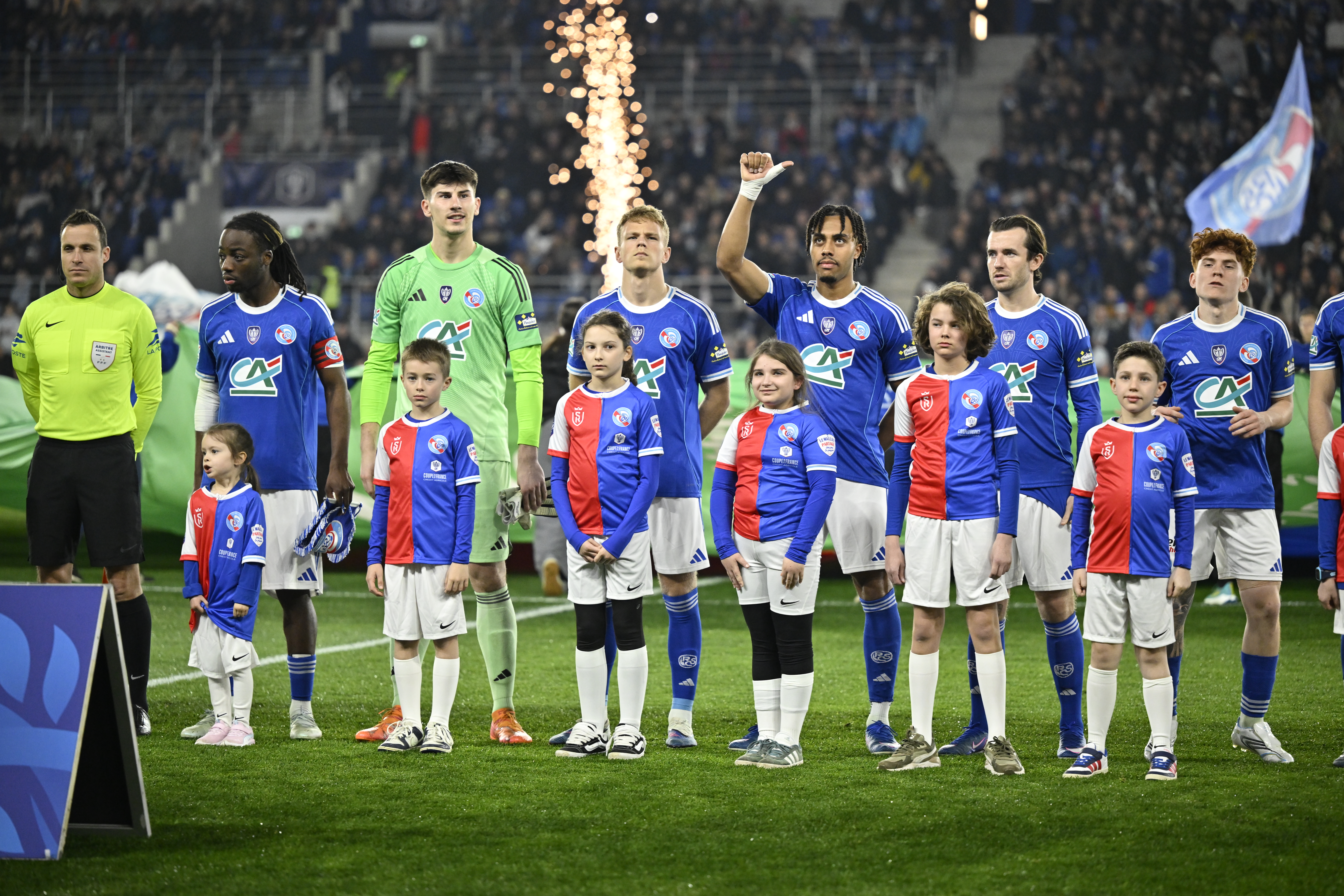 Dans chaque enceinte accueillant un quart de finale de la Coupe de France Crédit Agricole, les enfants accompagnateurs de joueurs - ici mardi à Strasbourg - ont arboré le « maillot partagé », une création unique qui réunit les couleurs des deux clubs (photo Kévin CLEMENT / ICON SPORT).