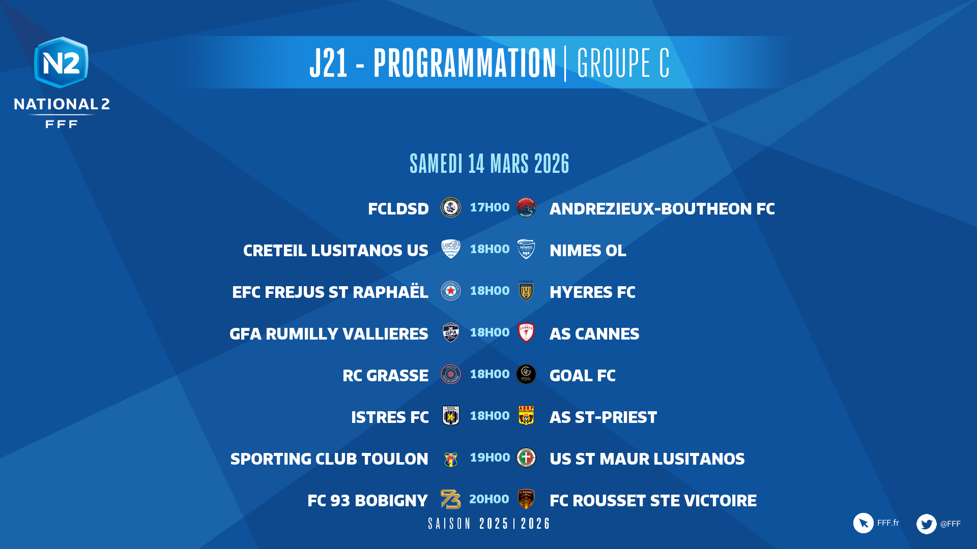 La 21e journée de championnat est au programme des équipes de National 2 qui, pour la plupart, ont rendez-vous samedi avec des coups d'envoi échelonnés (14h00, 17h00, 18h00, 19h00, 19h30 et 20h00). Trois rencontres avancées à vendredi soir font exception.